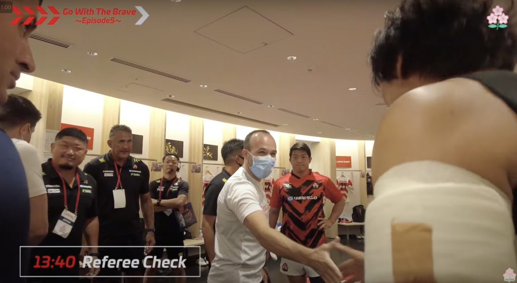 ウォームアップ前にレフリーチェックがあります。試合を担当するレフリーからの挨拶とレフリングに関する情報が共有されます。主にスクラムについての話になります。国際試合は外国人レフリーが笛を吹くので、ここでも通訳をします。