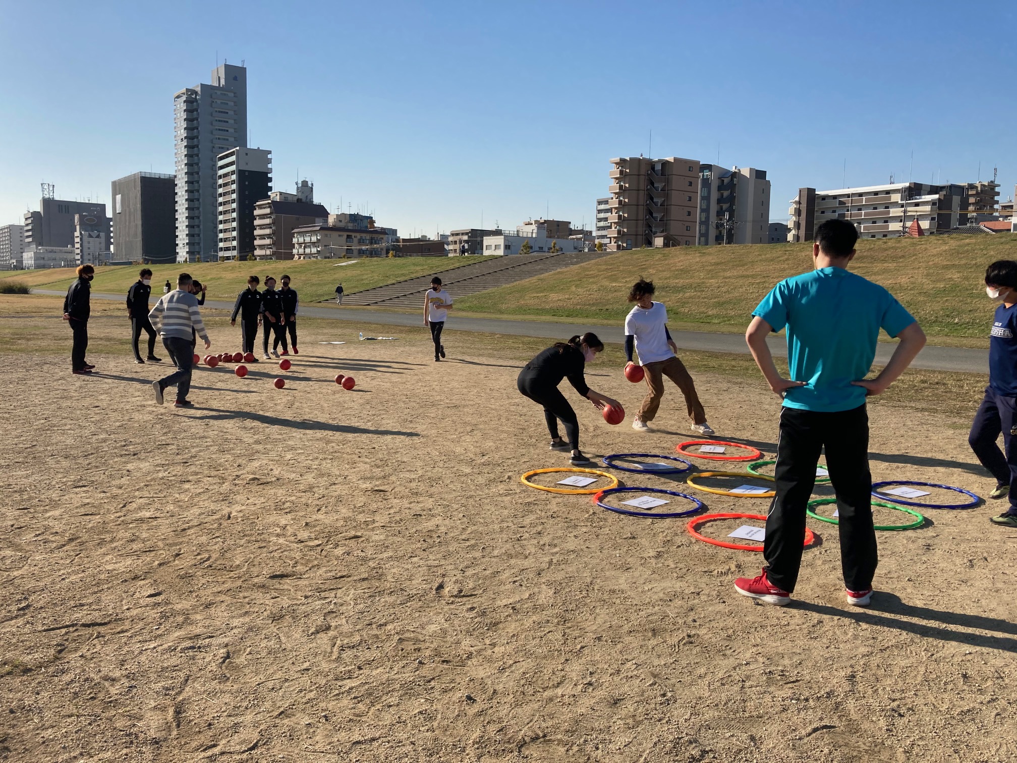 ライアン先生のフィジカルイングリッシュの授業では、スポーツ外国語学科のすぐ側にある河原に行って授業をしました。