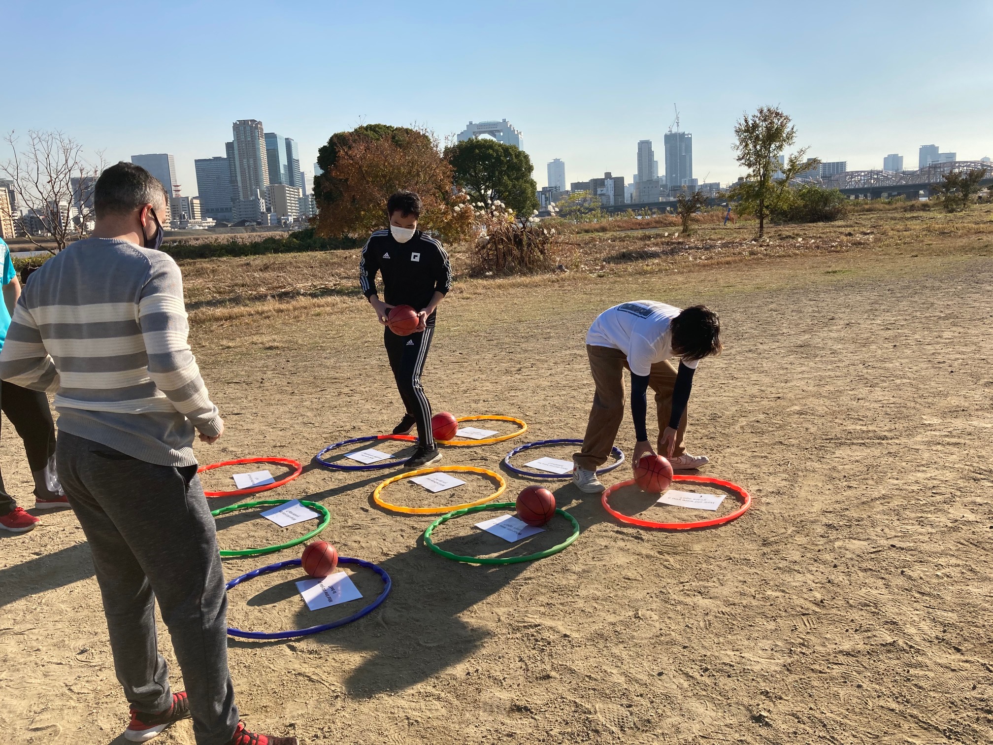 2チームごとの対決で、ボールを持ってスタートラインから走ってきて、フラフープの中にボールを置きます。そのフラフープの中にある英語の質問をチームのもとに戻って、次の人に質問します。