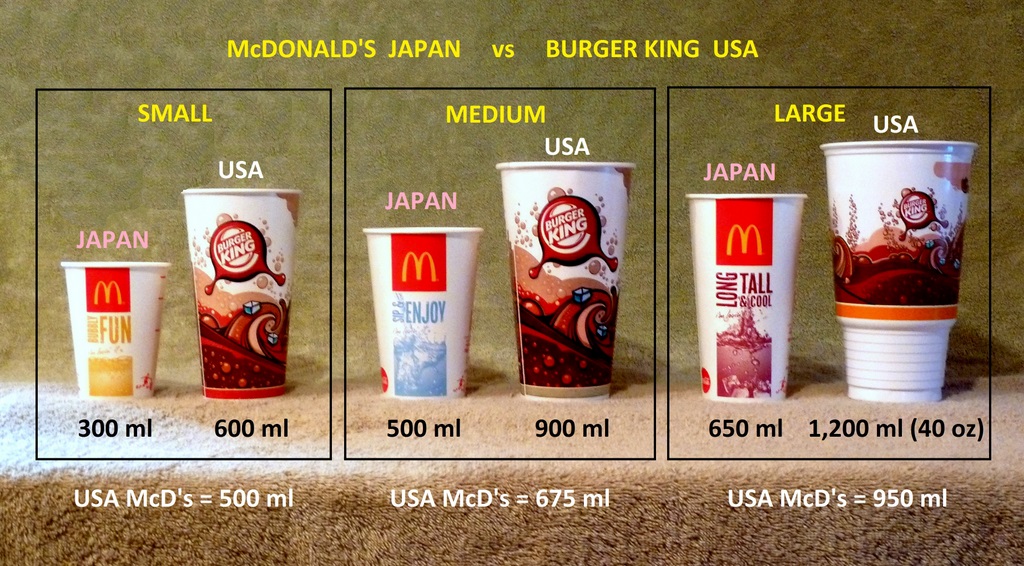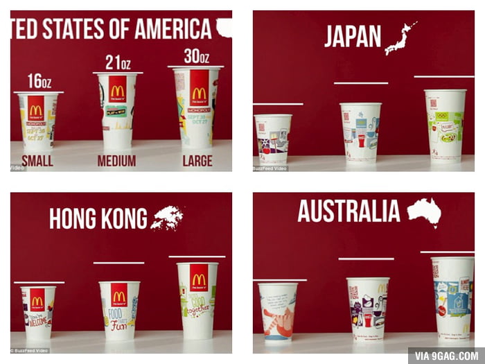 チーズ、車(日本でいう軽自動車がない)、アイスクリーム、ケーキ、鶏肉(鳥の丸焼きはどこでも買える)、家、道路(脇道、街路含む)、公園、マクドナルドの商品のサイズ(ハンバーガー以外、飲み物、ポテトなど:引用McDonald’s cup size compared to US. – 9GAG)、などなど)