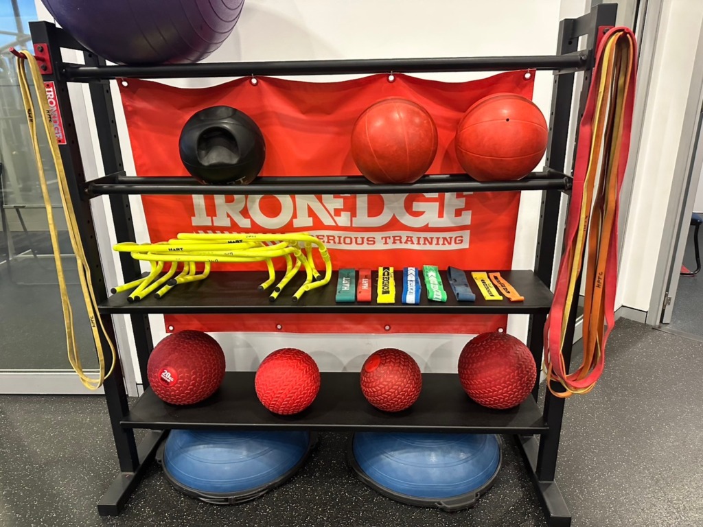 ※パワーラック8台、スミスマシン3台をはじめ、とてつもなく充実した設備です! 人工芝のマットが敷かれたエリアもあり、ストレッチや、動きながらのエクササイズも可能です。