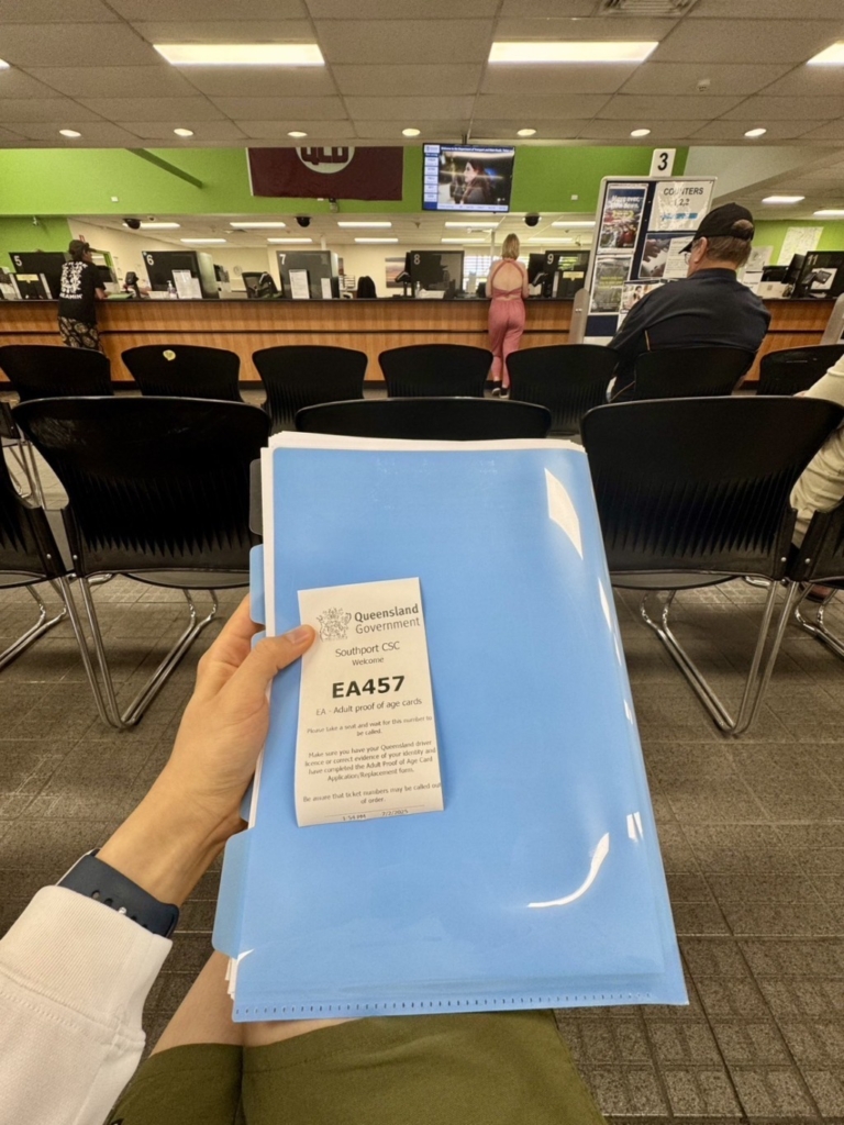 また、ブルーカードを申請するにあたって、CRN(Customer Referance Number)というオーストラリアのマイナンバーに当たる個人認識番号が必要であるため、一緒に+18カードも申請しました。役所についたら、まずはReceptionで要件を伝え、受付番号をもらう必要があります。 事前に何を言うか準備してきたのですが、やはり役所という環境なだけに、少し緊張しました……。