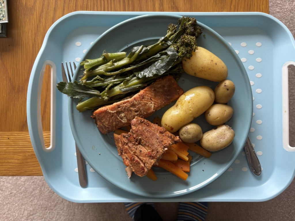 - Honey-glazed salmon with broccoli, carrots and boiled potatoes