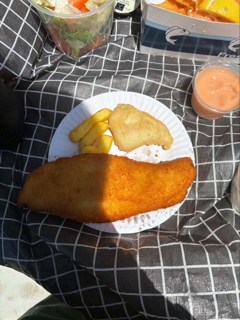 釣りをした後に、そのビーチの近くにある「Charis Seafoods」という魚屋さんが併設されたレストランでオーストラリアでよく食べられているフィッシュ&チップスを食べました。とても大きな白身魚のフライとフライドポテトが一緒になった料理でした!日本では食べたことのない組み合わせでしたが、一緒に付いてきたソースとレモンをつけて食べると、とても美味しかったです!