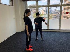 ↑学生Aが英語、学生Bが日本語に通訳、学生Cがその指示に従ってトレーニングをします。