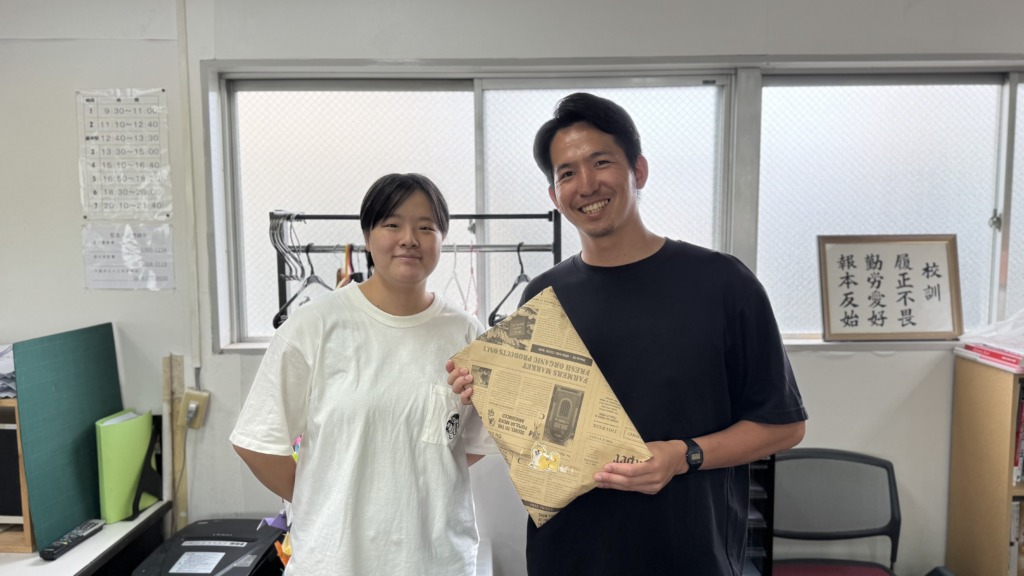 2025.09.19 卒業生の心遣い 先日卒業生の上野さんが来てくれました。 頑張ってます! 年上の後輩が出来たようです。 しかも7月に尾﨑先生にお子さんが出来たので 出産祝いまで! 気遣い素晴らしいですね! 尾﨑先生 『出産祝い、お待ちしています!』 って言いそうです(笑) 卒業生が来てくれるのは、嬉しいですね! 前の記事 記事一覧 次の記事