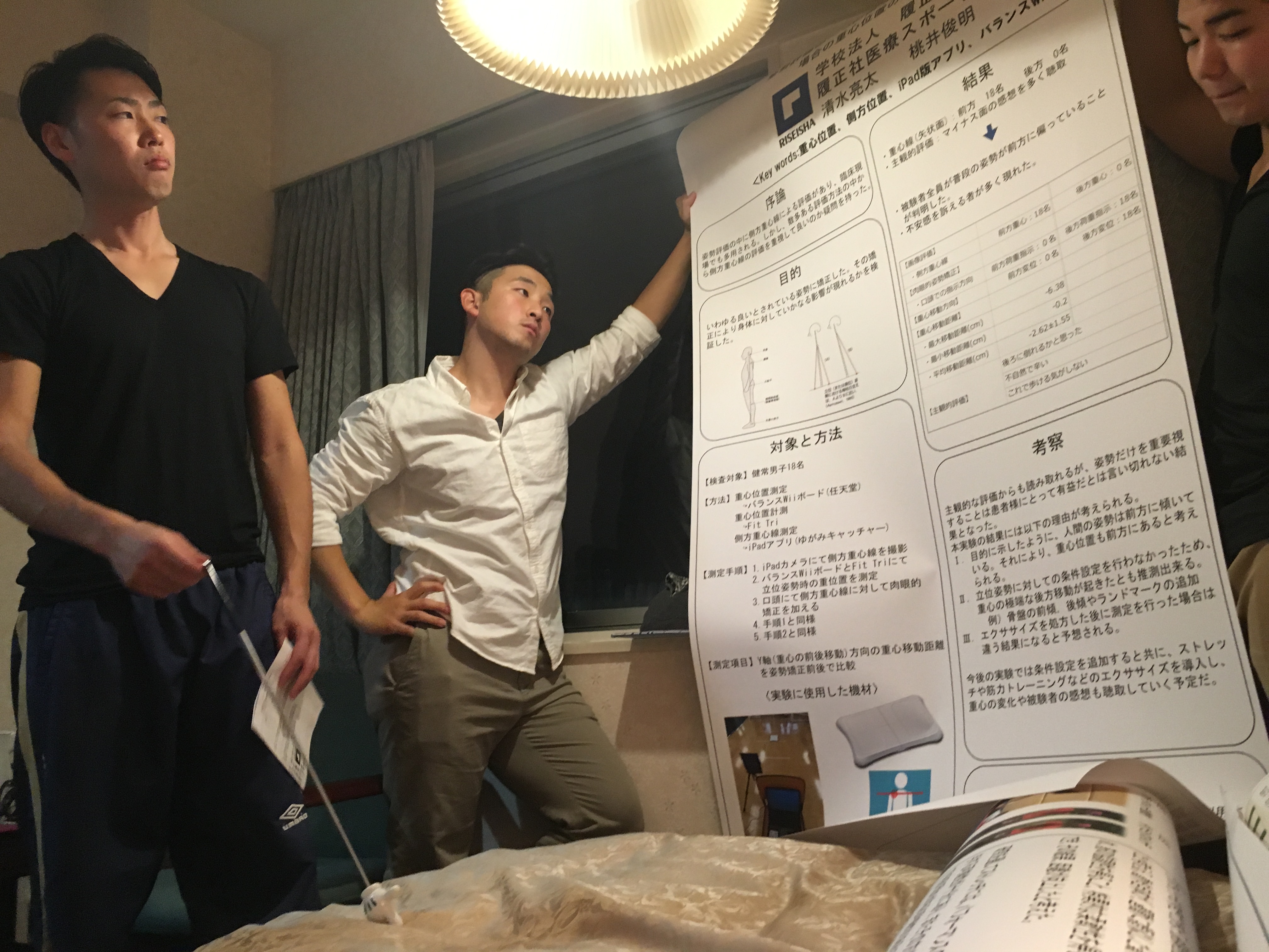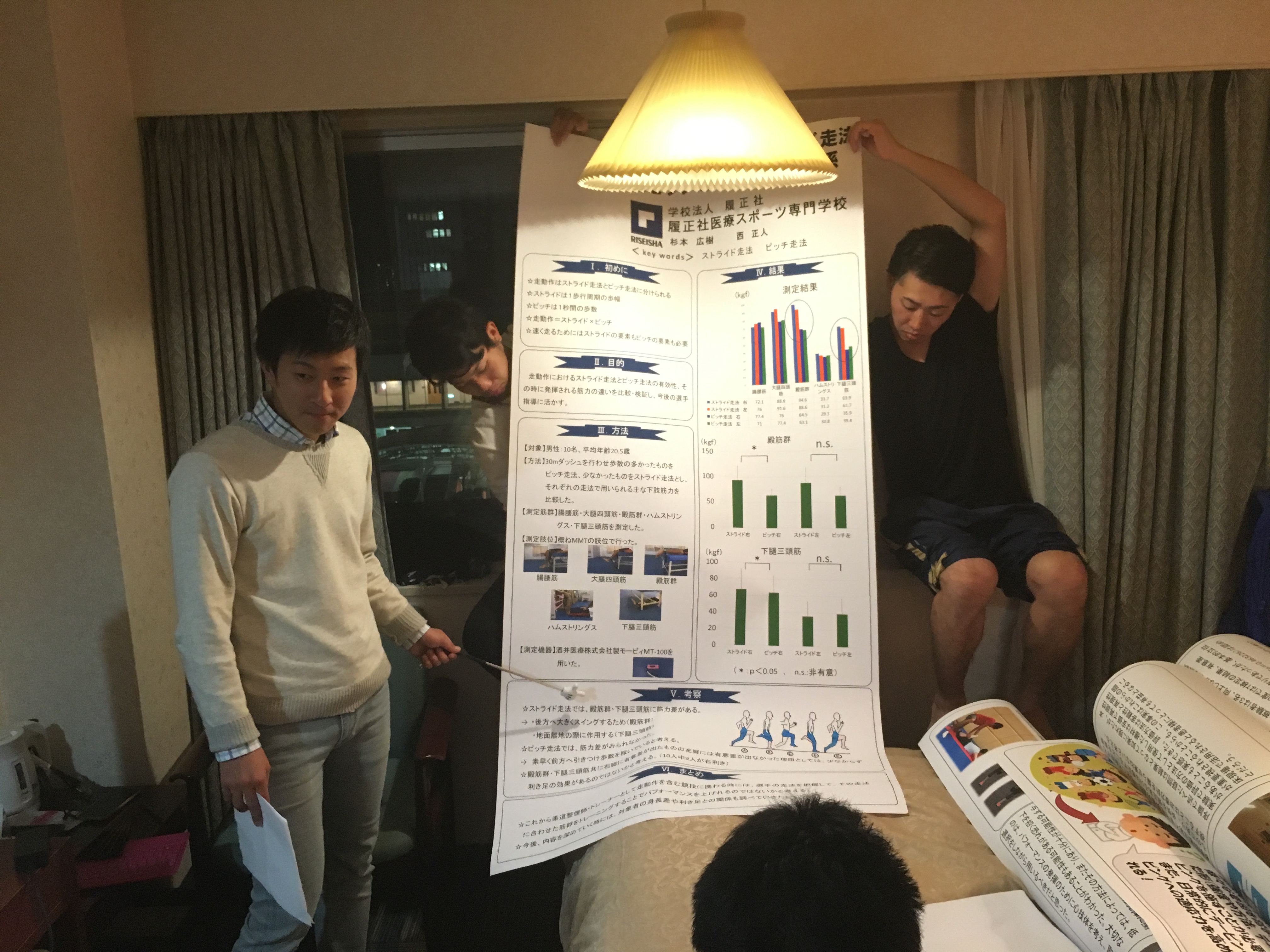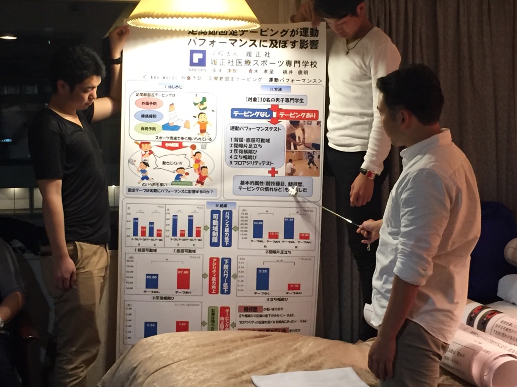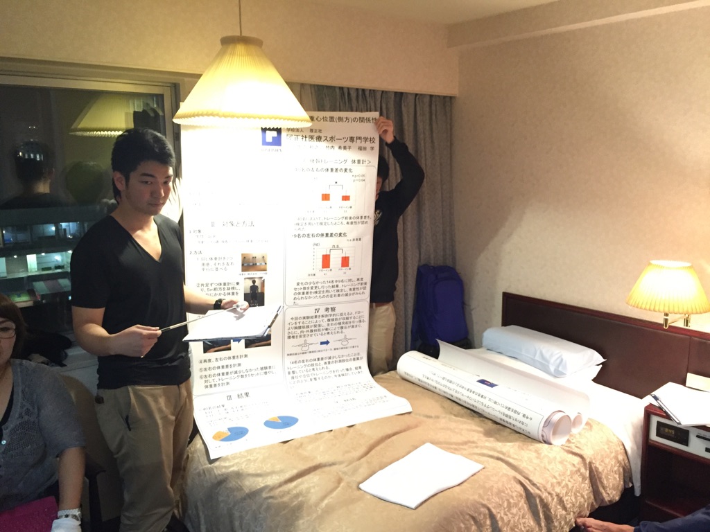 2015.11.06 接骨医学会IN新潟 「準備編」 こんにちは。 この週末、新潟の地で日本柔道整復接骨医学会が開催されます。 校内学術大会、近畿学会に続き、今年度最後の学会となり、 先鋭6名がポスター発表を行います。 学会前夜の練習の様子をちょっと覗き見してみましょう。 みんなで順番にポスターを持ち、熱気ムンムンの室内で一生懸命練習しました。 さぁ、これで明日はバッチリ!!明日に備えて、寝るぞーーー!! 前の記事 記事一覧 次の記事