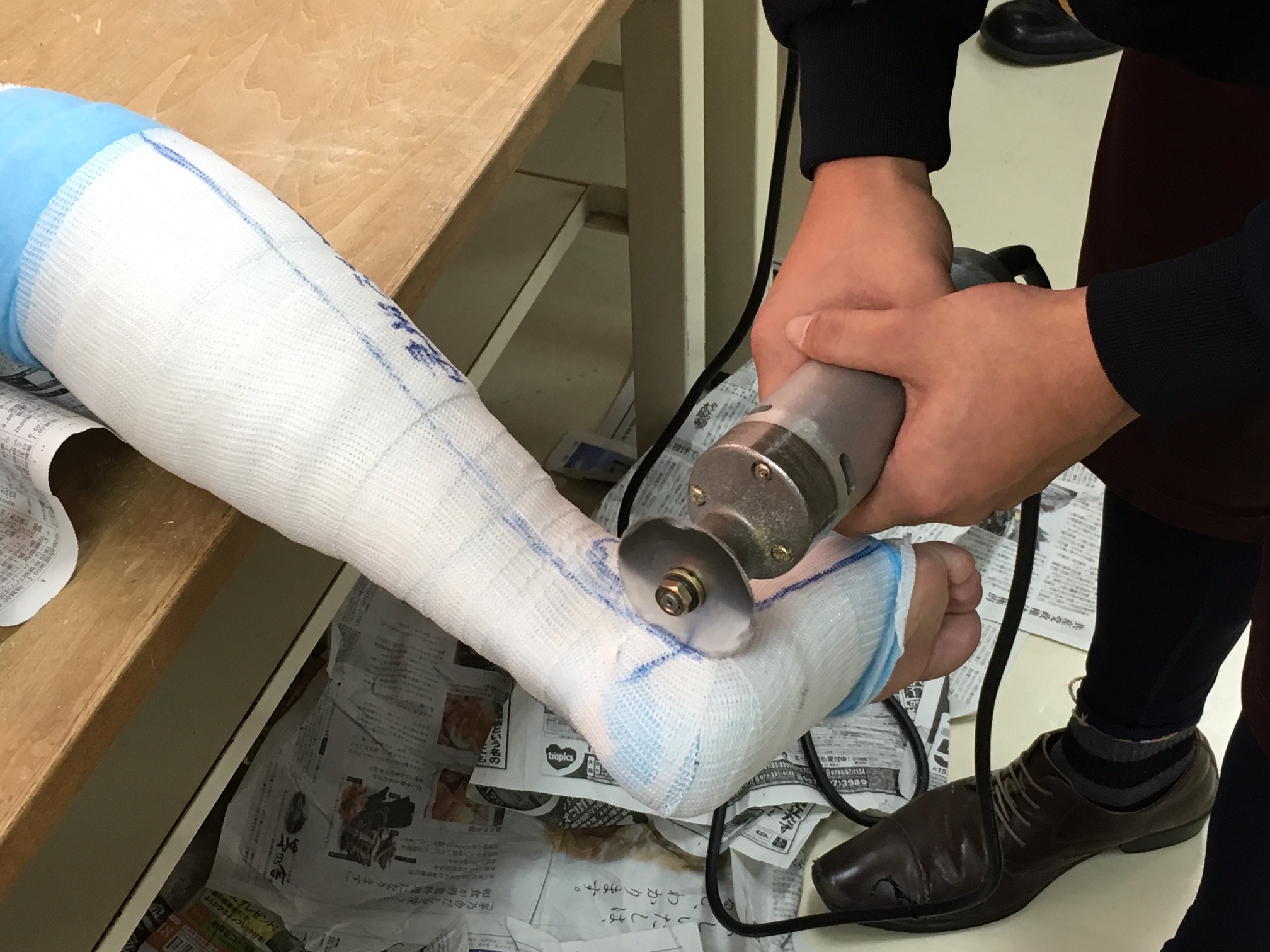 この実習で用いるのは「キャストライト」という種類で、昔ながらの石膏などと比べると非常に軽く、患者さんへの負担も軽減できるものになります。