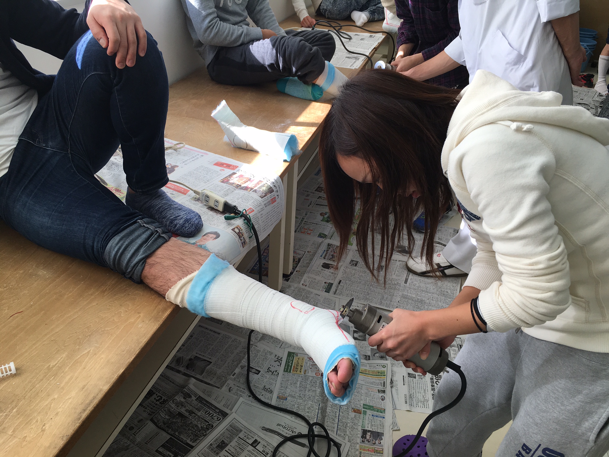 昨日、1年生の授業でギプス固定の実習を行いました。