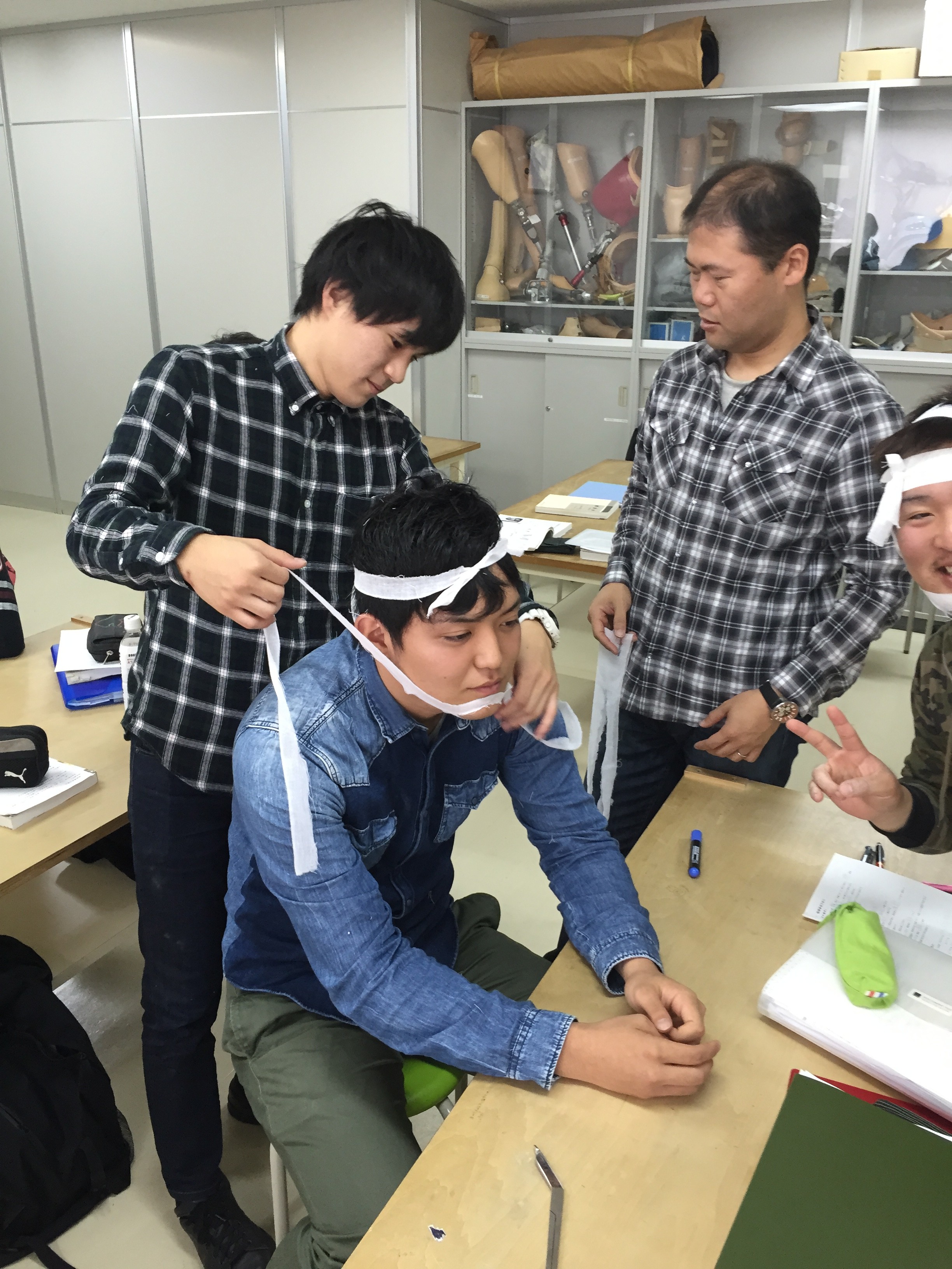 2015.12.15 顎関節脱臼の整復と固定 こんにちは。 先日、2年生が授業で顎関節脱臼の整復と固定の実技実習を行いました。 顎関節脱臼は比較的女性に多く、あくびなど口を大きく開けた時に発生することがあります。 整復では、ゴム手袋をして、実際に相手(患者役)の口の中に指を入れて、整復動作の練習をしました。 最初は口の中に指を入れることに違和感を感じながら、それでも将来、戸惑いなく整復できるように頑張って練習をしていました。 固定では、投石帯という固定法を行いました。 普段はなかなか練習をしない固定法なので、記念写真を撮ってみました! 前の記事 記事一覧 次の記事