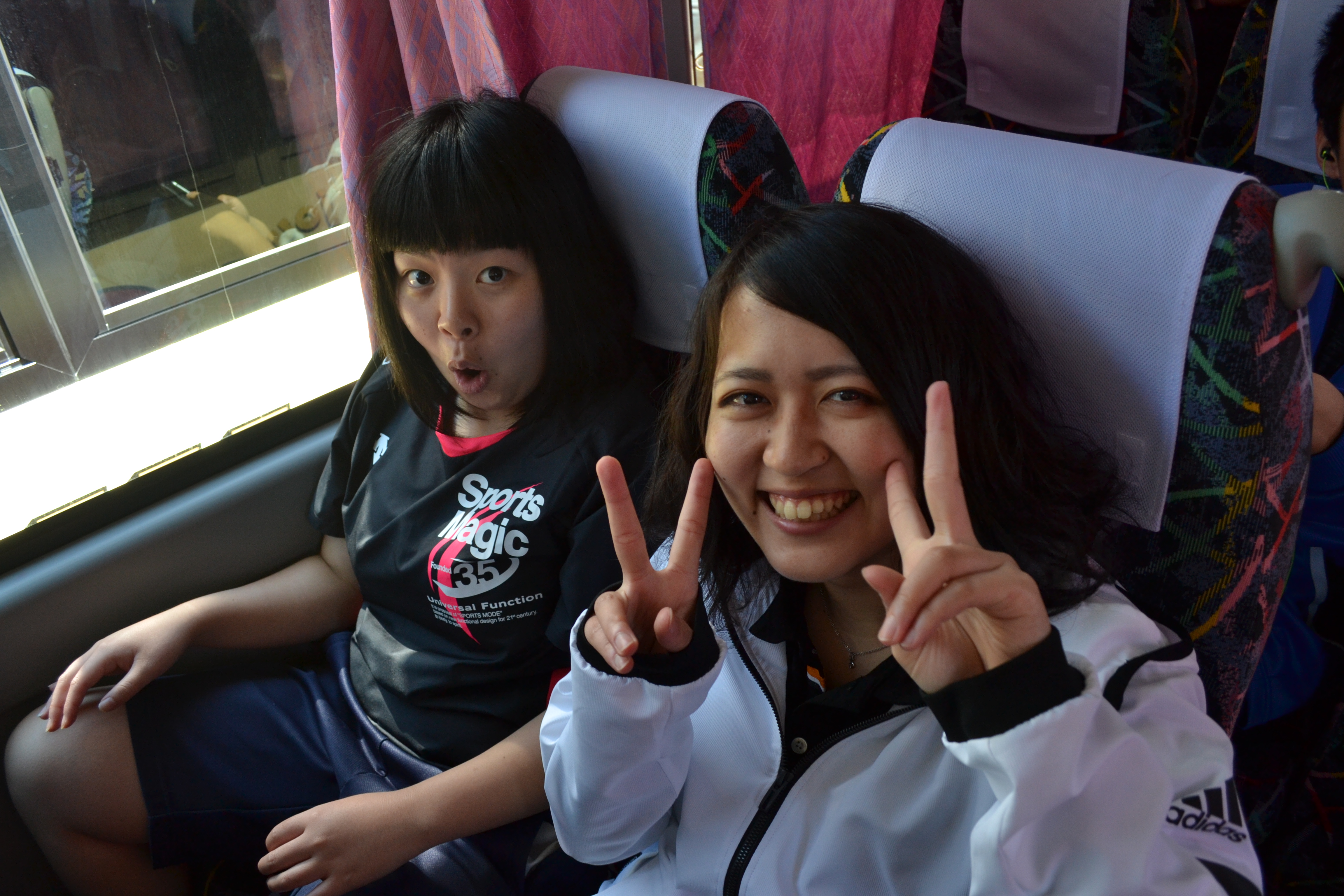 バスの中ではいチーズ。まだ元気いっぱいです。