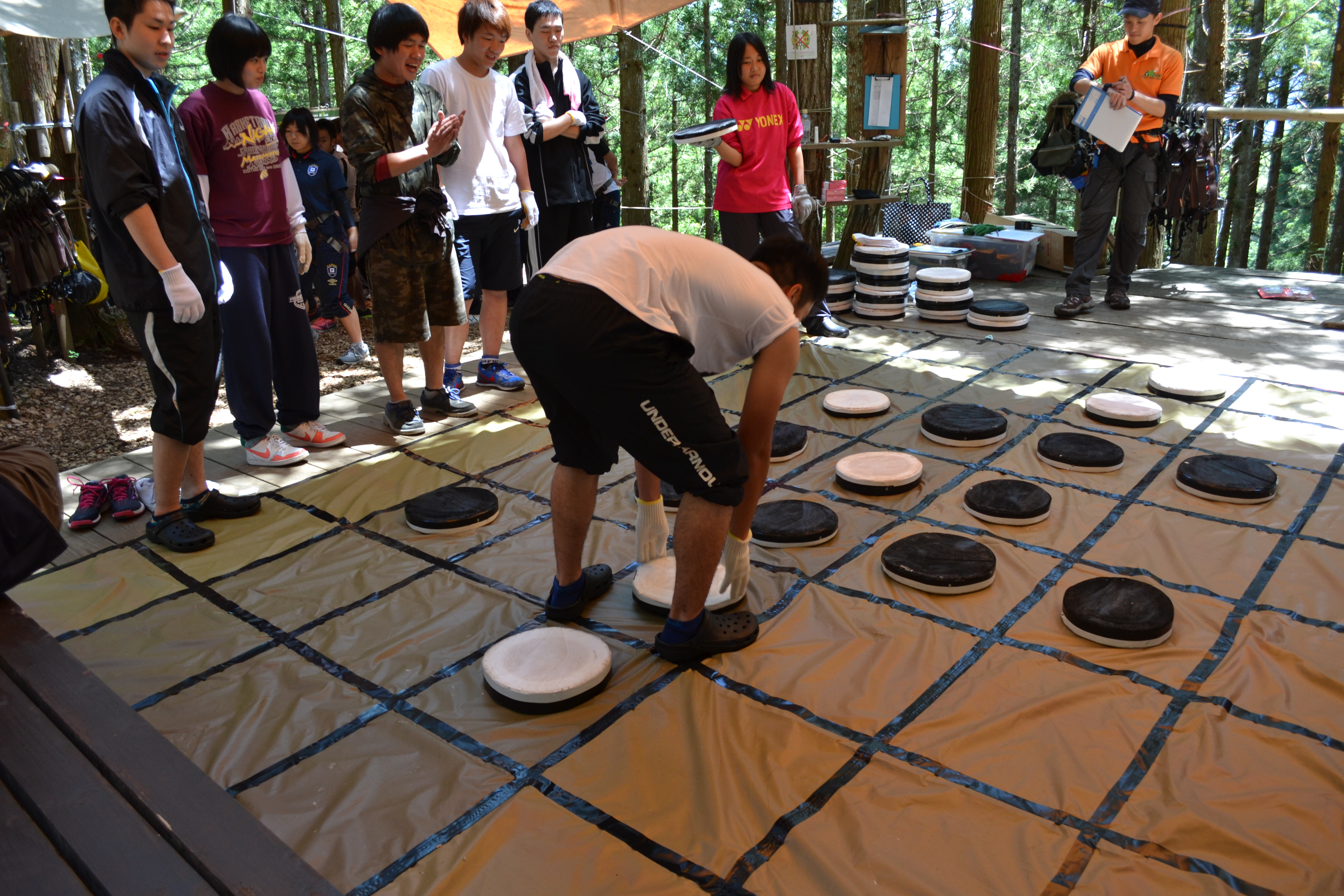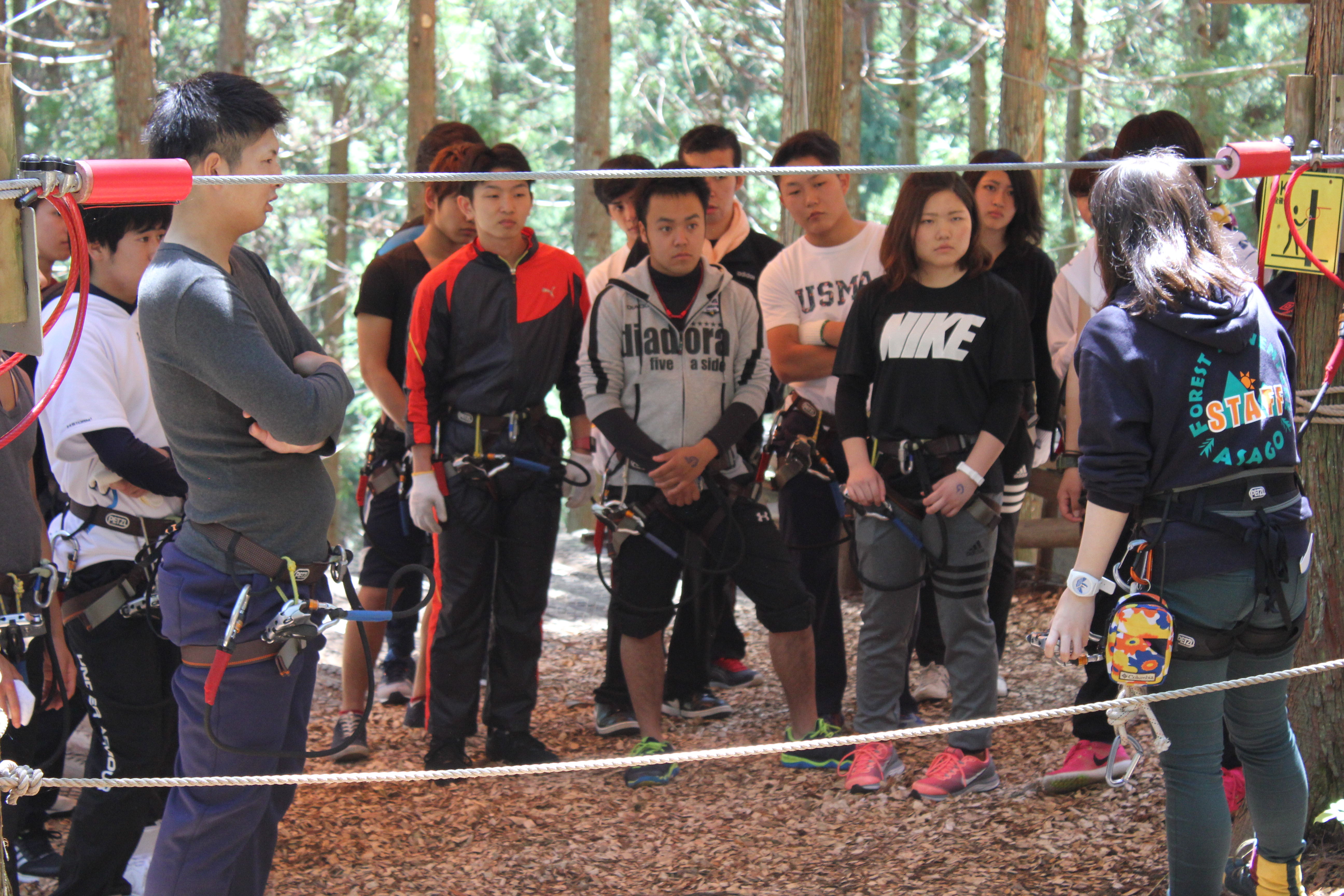 さて、学生はというとスタッフさんに、ひとりひとりハーネスをつけてもらい、安全講習を受け
