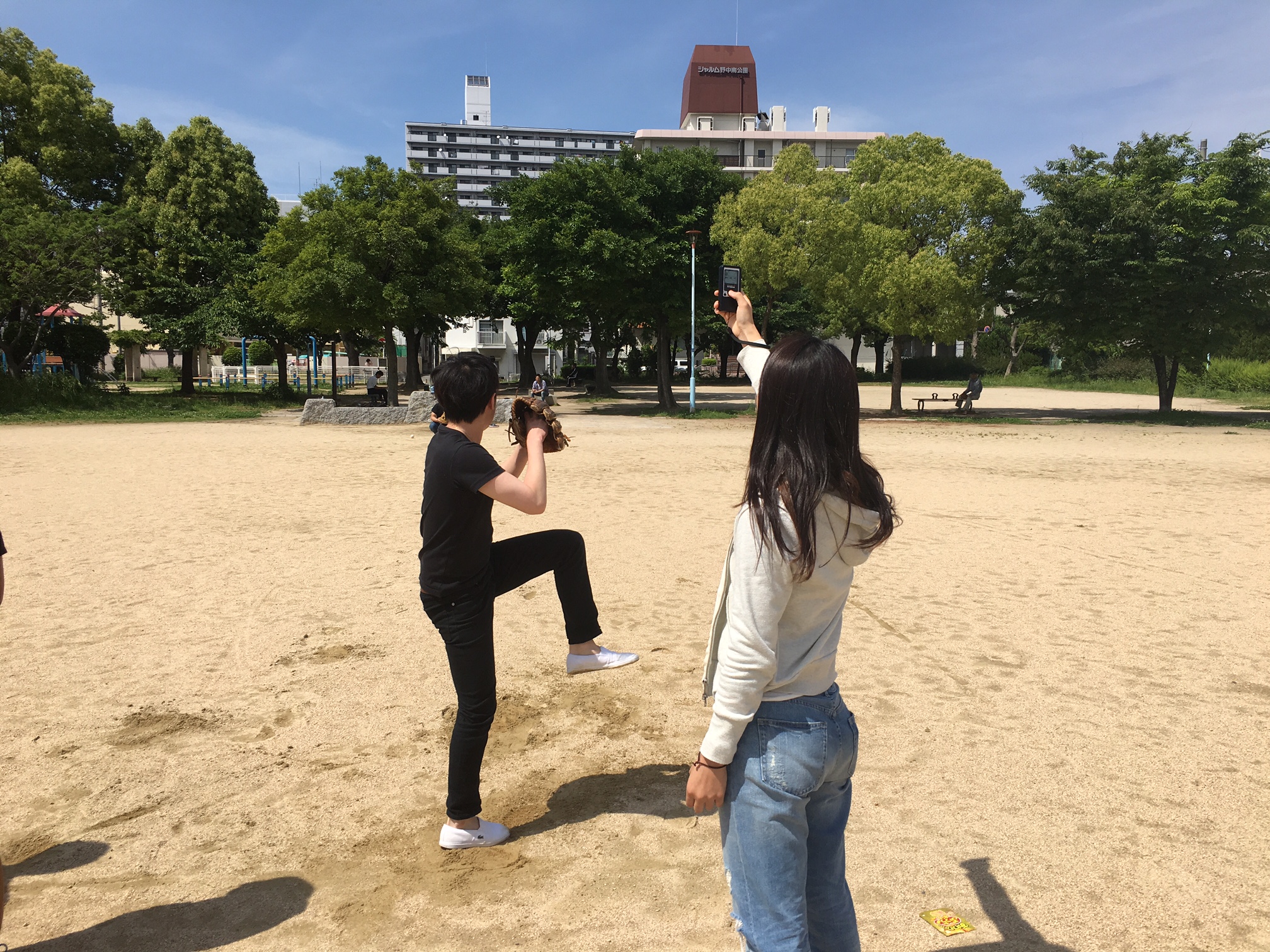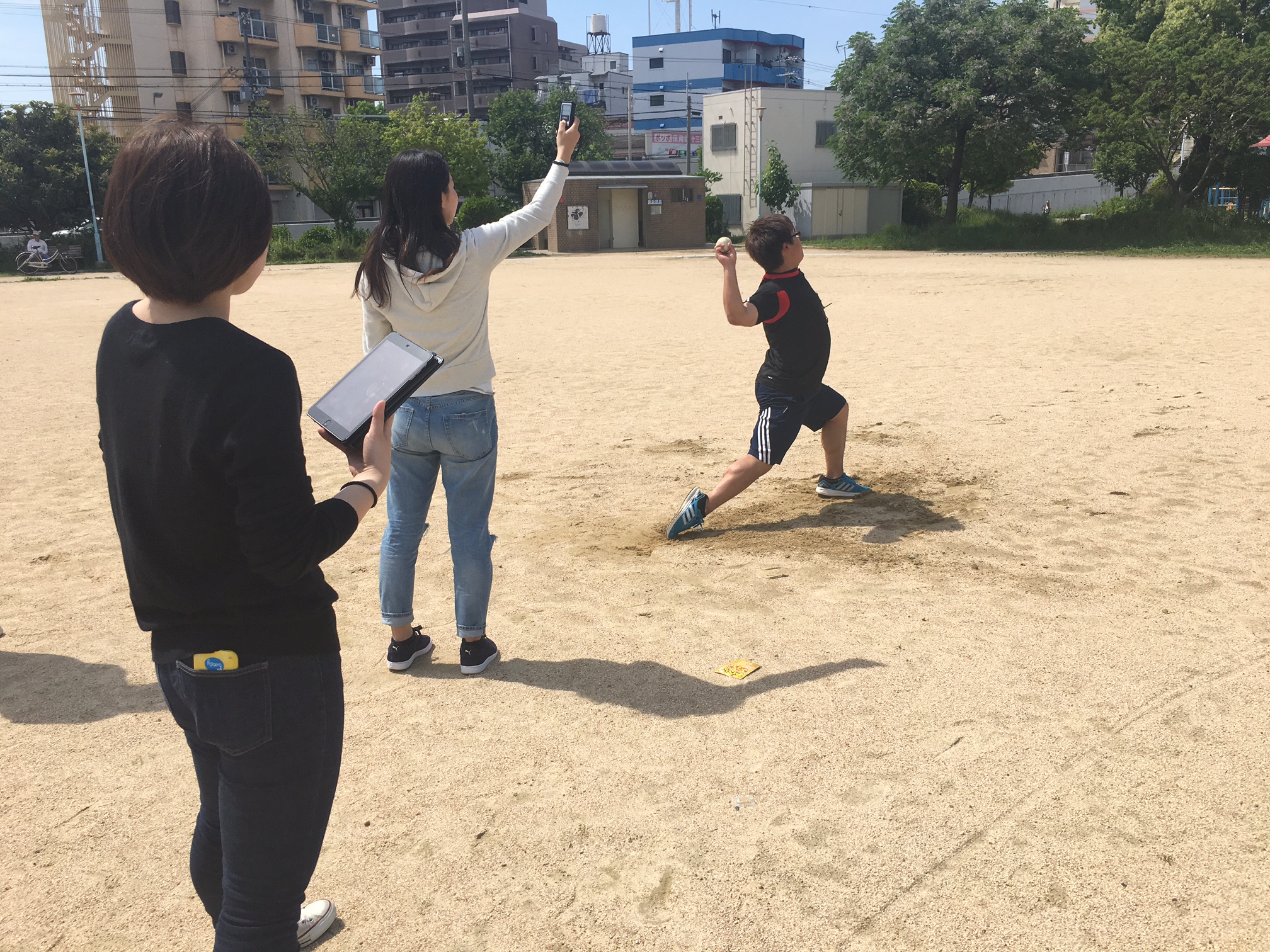 2016.05.21 青空教室♫ こんにちは! ここ数日は晴れが続き、日中の気温も高くなっていますね! あまりにも天気が良いので、休み時間に学校近くの公園でキャッチボールを。 決して遊んでいるわけではありませんよ! これも卒業論文作成の為の実験で、 スピードガンを用いて投球速度の測定をしています。 「ストレッチと投球速度の関係性」がテーマだそうです。 面白い結果が出ると良いですね! もう少し実験が続くそうなので、僕も青空勤務を楽しみたい思います(^_^) …遊んでるわけではないですよ!! 前の記事 記事一覧 次の記事