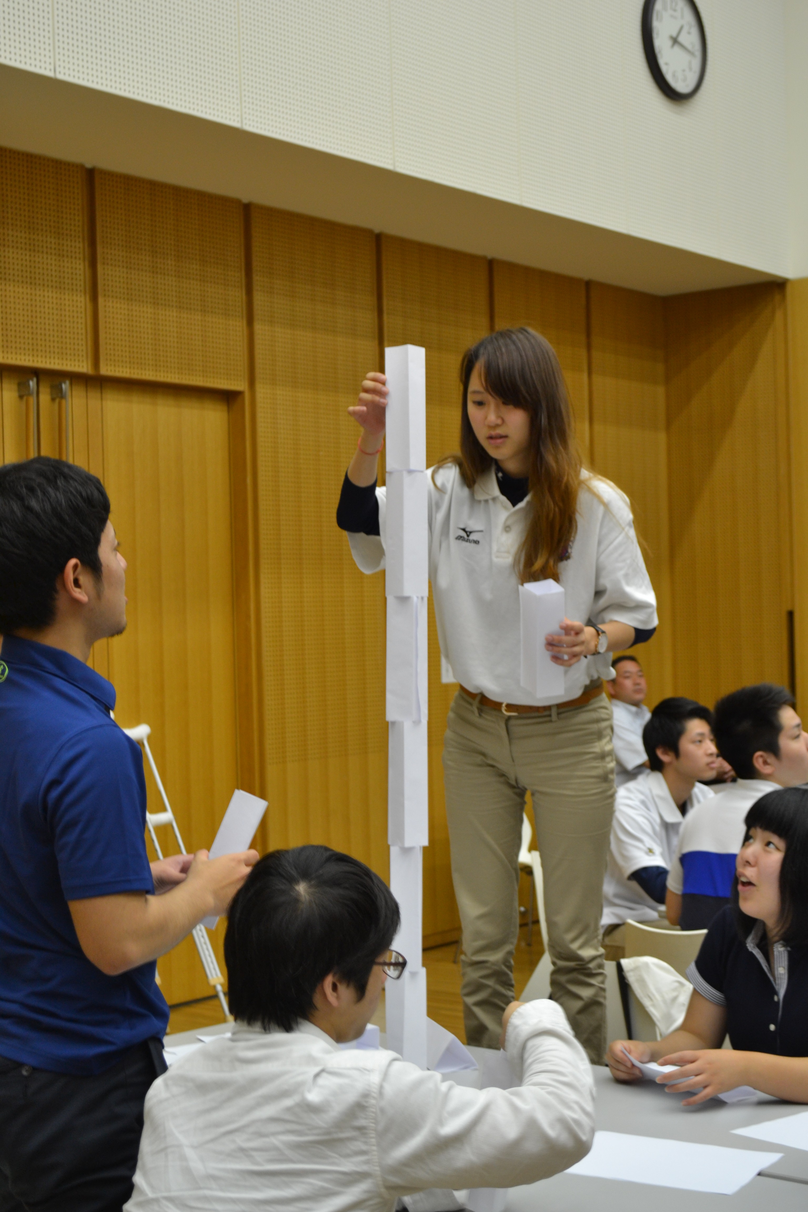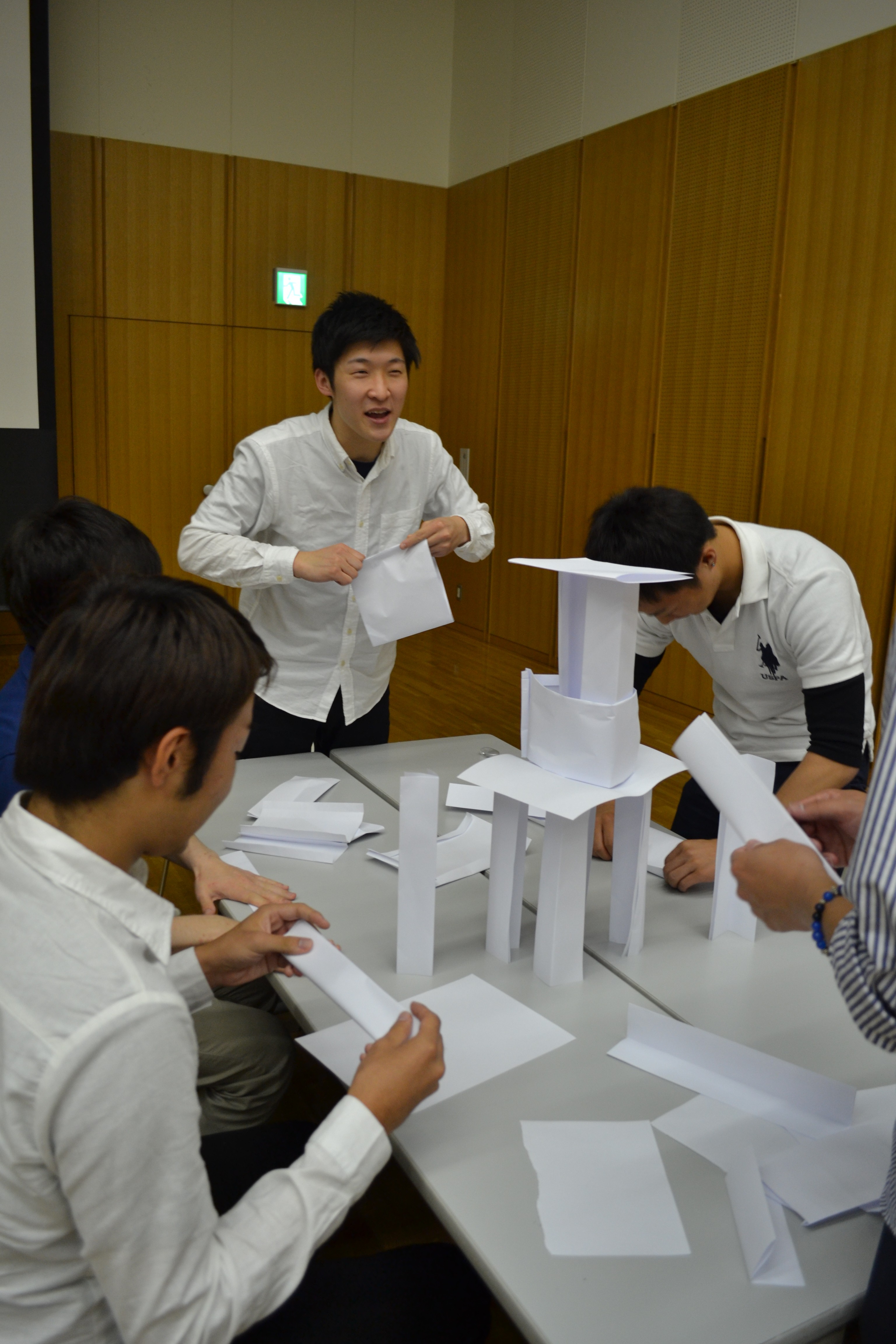 作戦タイムで、30枚の紙を道具を使わず、高く積み重ねるかを相談しました。