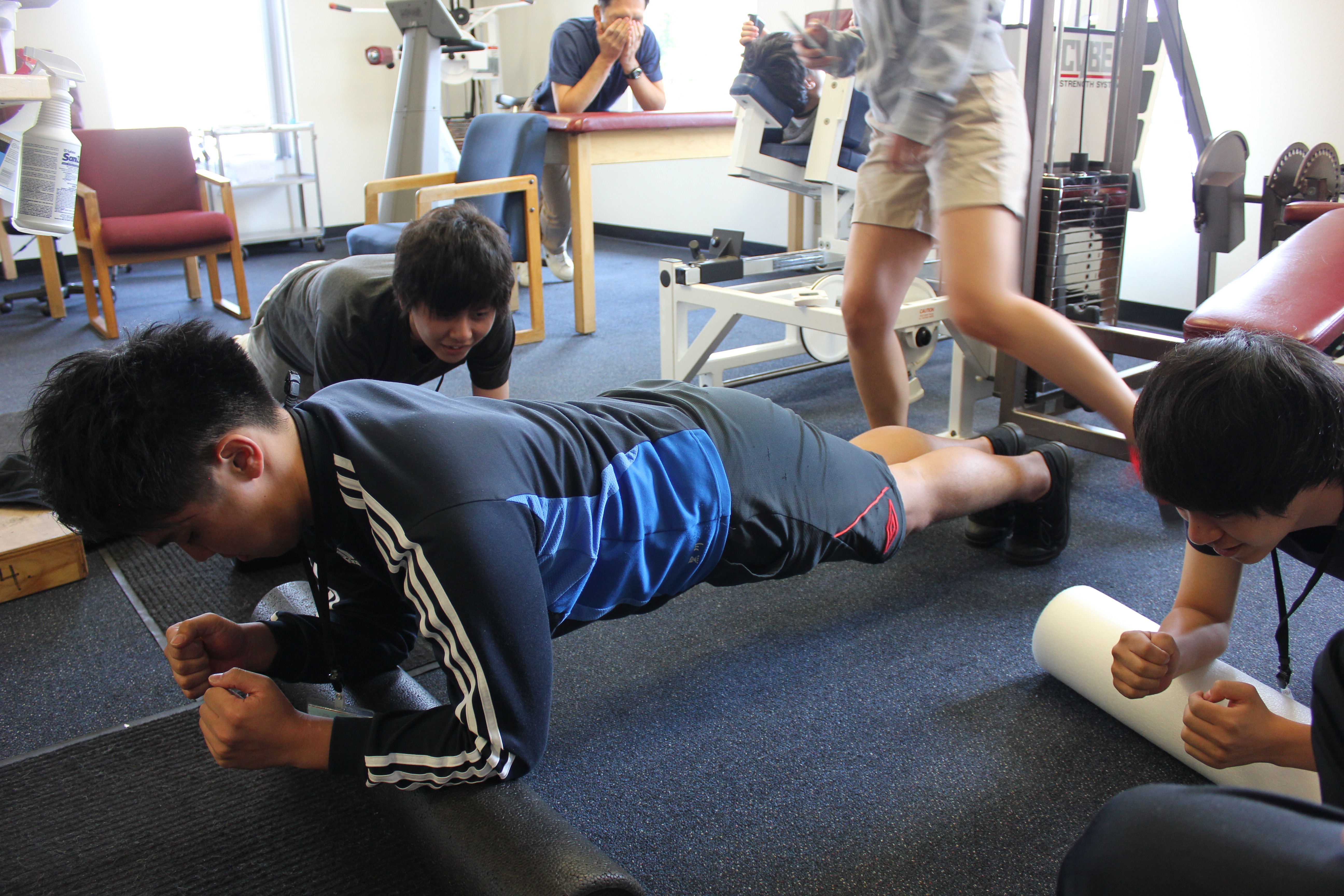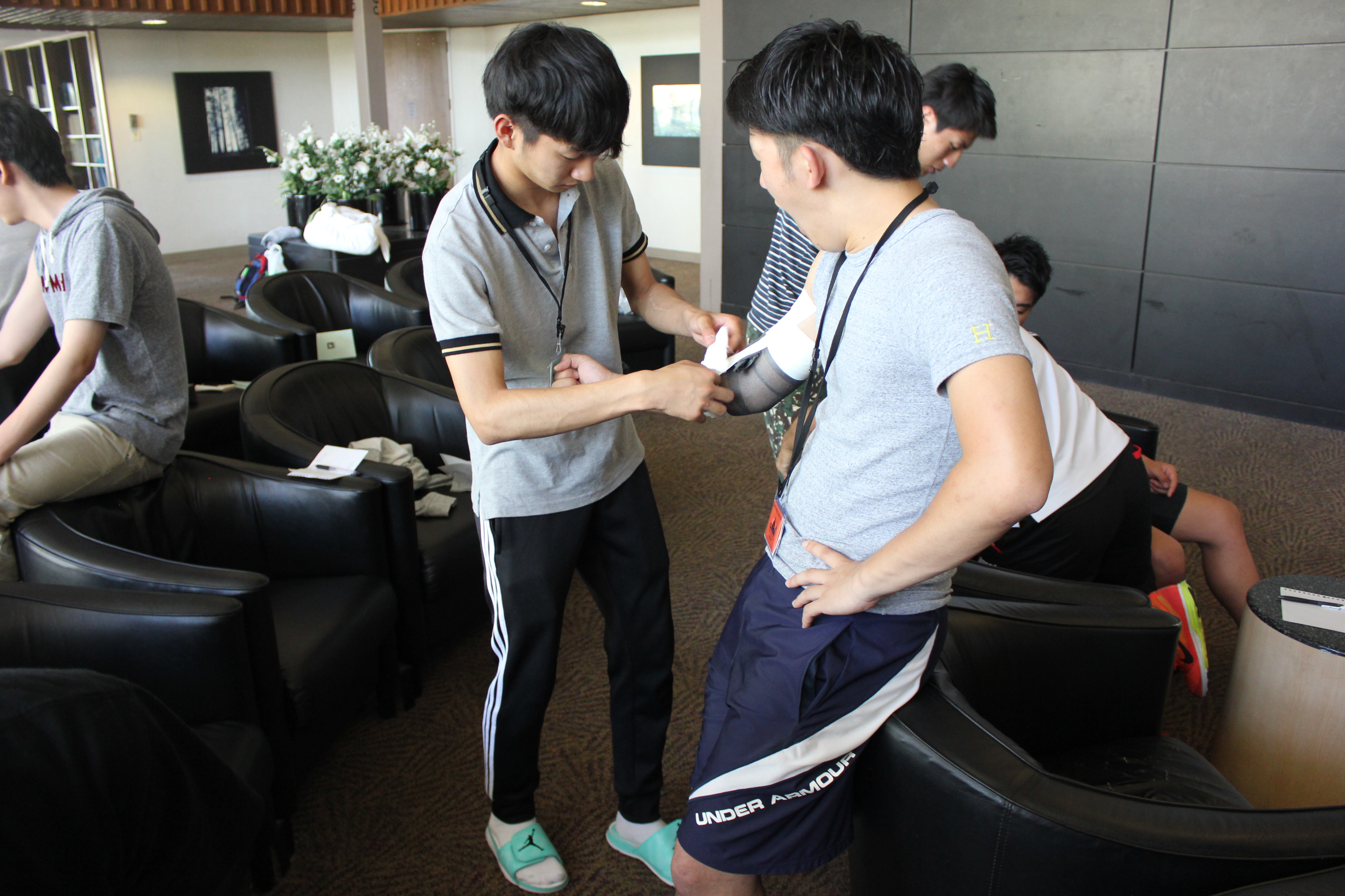 この写真は5班の田畑が足底のアーチをテーピングで作ってもらっているところです。