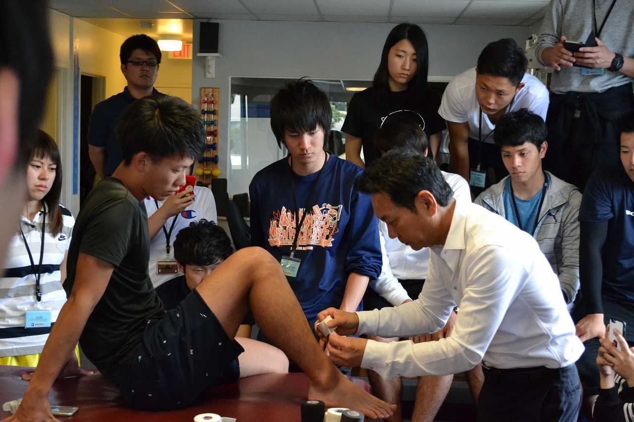 午後はテーピング実習でタケ先生に色々なテーピングのやり方を教えてもらいました