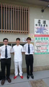2枚目の写真は、西宮市の高田柔道接骨院。今は珍しい、少年柔道場を併設している施設です。左から実習生の福畠君と卒業生田中君、そして実習生の正木君。