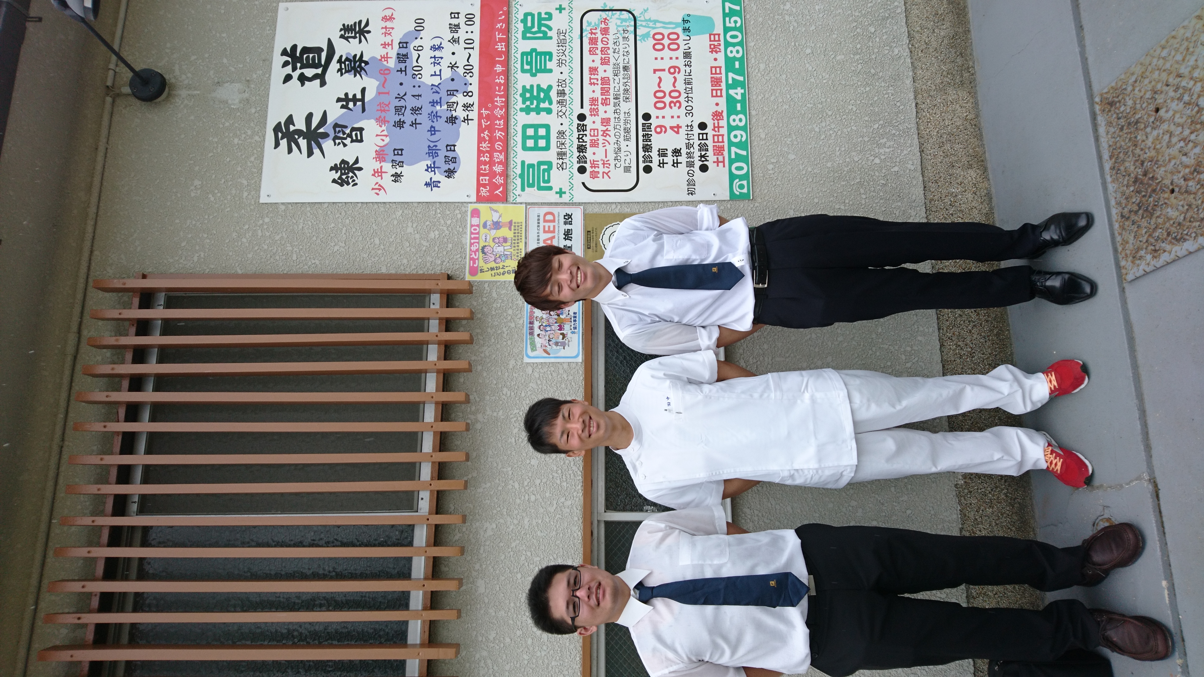 2枚目の写真は、西宮市の高田柔道接骨院。今は珍しい、少年柔道場を併設している施設です。左から実習生の福畠君と卒業生田中君、そして実習生の正木君。