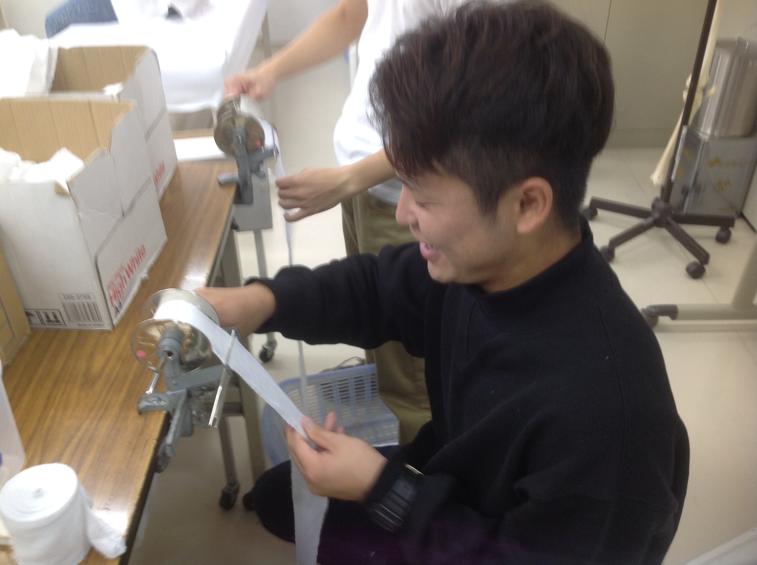 2017.10.14 日々是精進☆ 3年生の放課後の写真です。 日々、技術向上に向け練習しています。 ちなみに、使った包帯はこの用具で巻き直しします。 1年生時に比べ、早く、うまく巻き直せるようになっています。 日々是精進です☆ 前の記事 記事一覧 次の記事