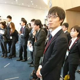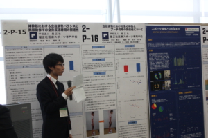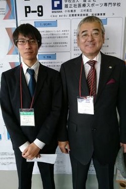 11月3日と4日、今年は大阪で開催された、日本柔道整復接骨医学会学生発表の部では、堂々とした様子で発表した。タイミングよく釜谷校長とのショットもとれた。