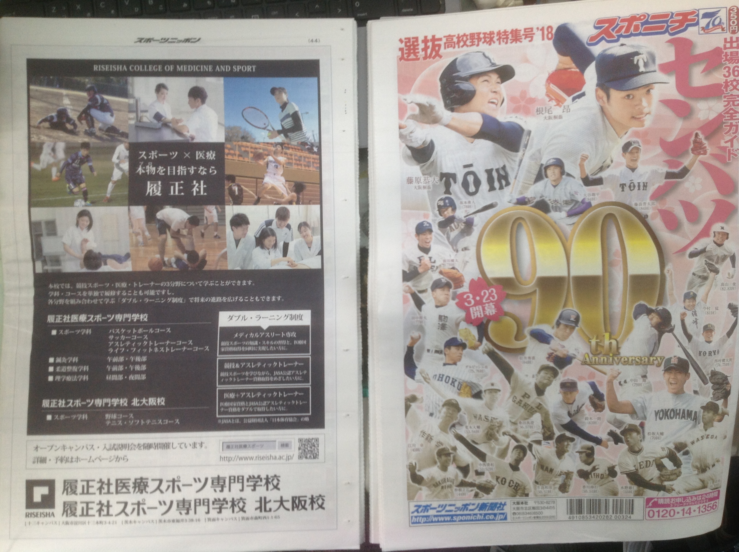 2018.02.17 選抜高校野球特集号 スポニチさんの選抜高校野球特集号’18の裏面は、 「履正社医療スポーツ専門学校」 「履正社スポーツ専門学校」 の全面広告になっています。 今回の「センバツ」は、 本校在校生の後輩達も多数出場しますし、 講師の中谷先生のご子息も出場! 残念ながら履正社高等学校は出場できませんが、 90回記念大会、非常に注目度が高い大会です。 前の記事 記事一覧 次の記事