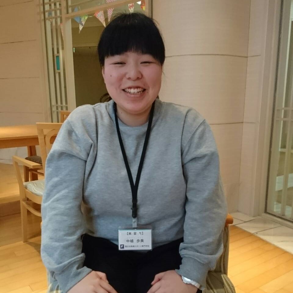 写真は将来、機能訓練指導員を目指す2年実習生の中植さん。