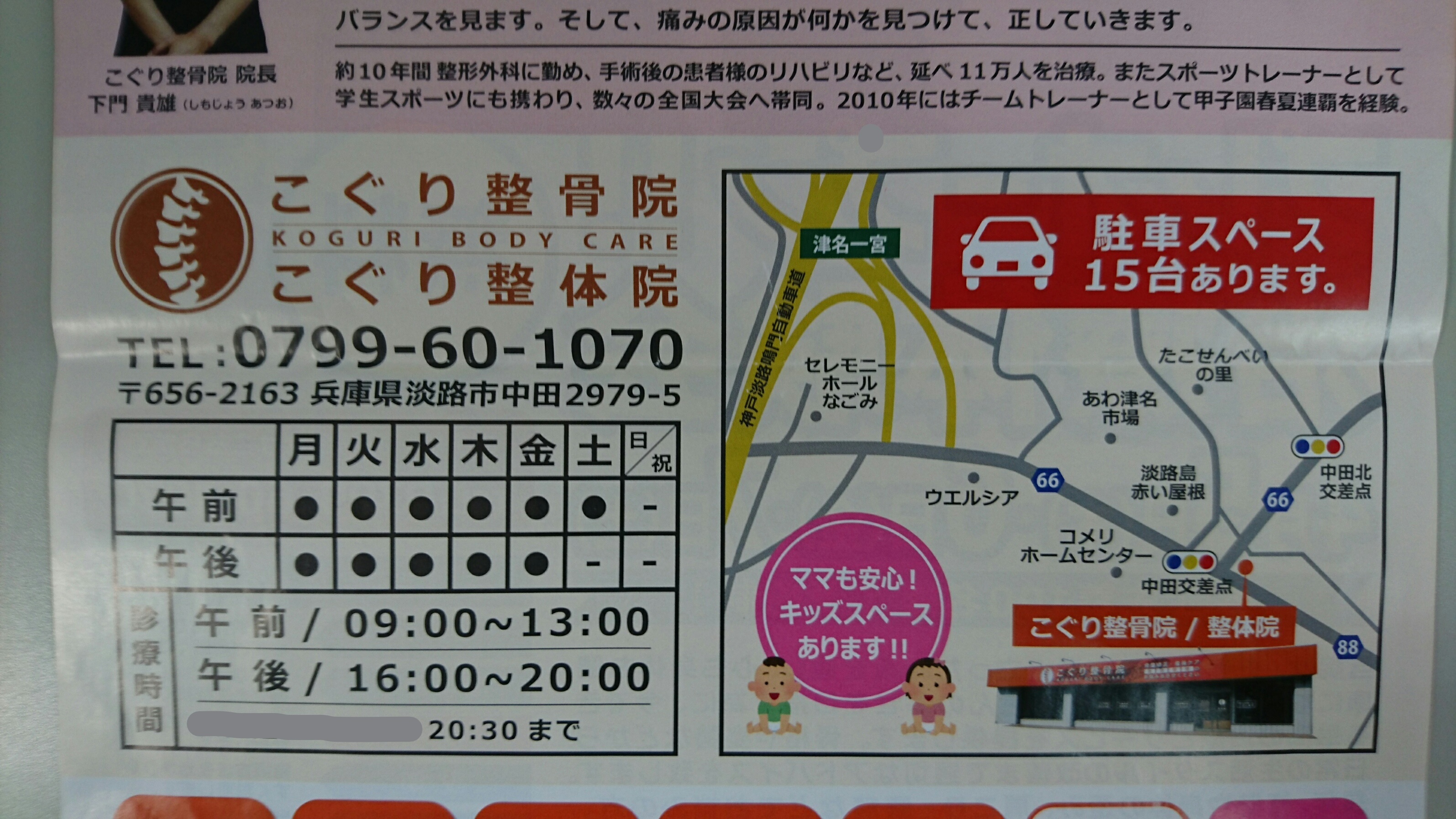 彼と出会って約7年。今彼は古栗総院長の下で分院長(管理柔道整復師)としてマネジメントを任されている。写真にあるのは、そのリーフレット。先日2年生の実習で古栗先生と面談した際に、すでに100人近い患者さんが通院しており、大変にぎわっているとか。