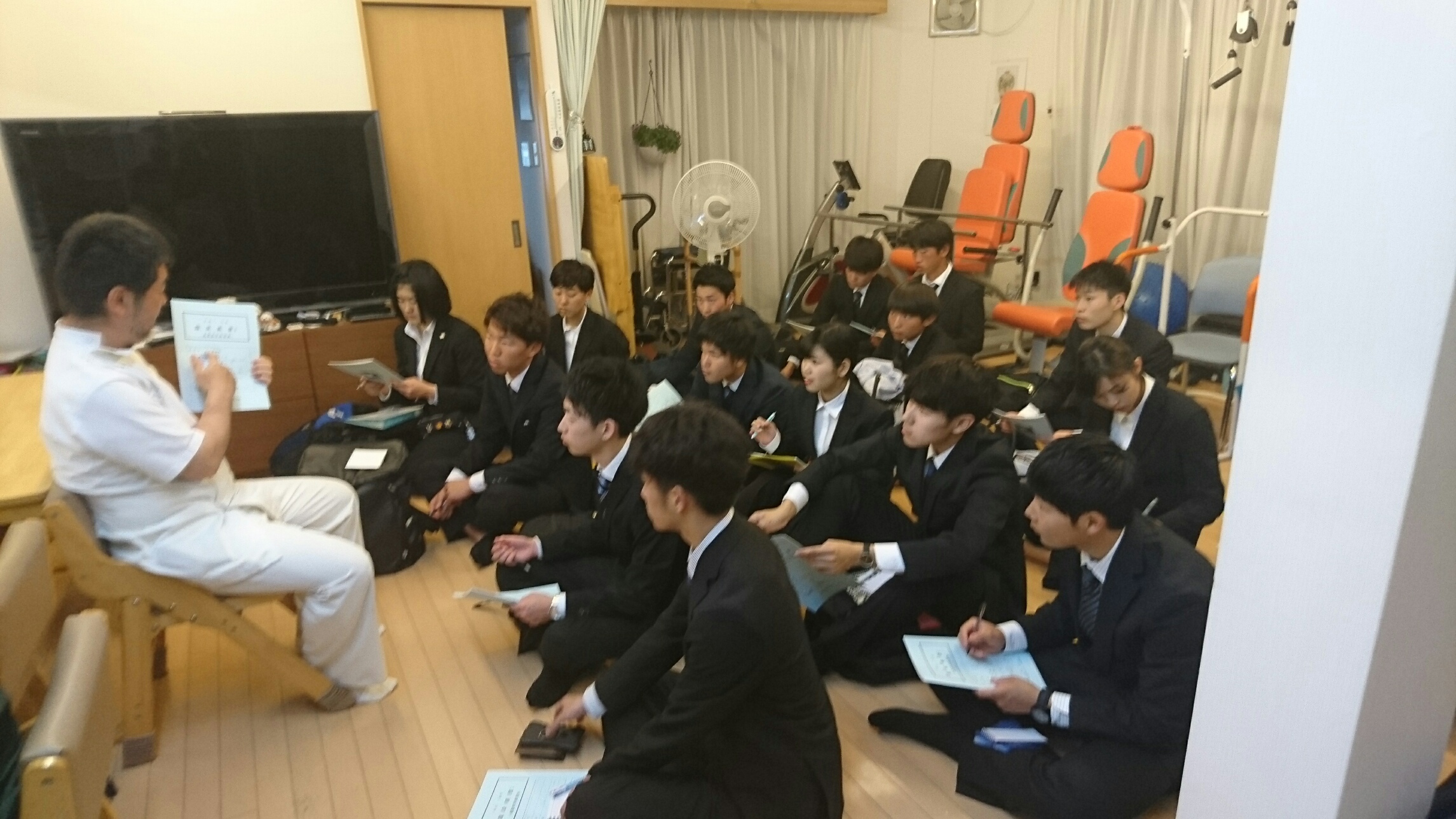 2018.05.17 1年生初めての実習「基礎見学実習」 1年生は6月から順次、基礎見学実習が始まります。 基礎見学実習では柔道整復師の仕事を理解し、今までの患者さんとしての立場ではなく、医療人としての立場で見学実習を行います。 今回は、来月から実習が始まる学生16名と事前訪問へ行ってきました。 先生から実習中の注意事項を受け、一人ひとり実習前の挨拶や抱負を述べました。 緊張している様子もありましたが、皆それぞれしっかりと発言できていました。 1年生は初めての経験ばかりですが、意欲的に頑張ってください! 挨拶終了後、ホっとした表情の一枚。 前の記事 記事一覧 次の記事