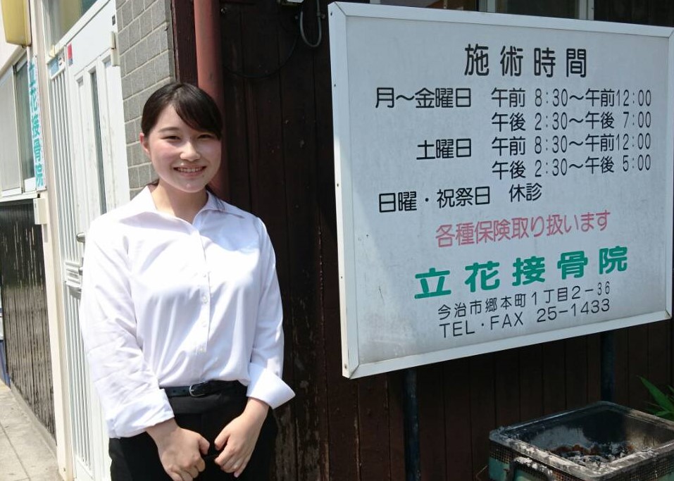 第1期夏の実習先として、愛媛県今治市にある本校の実習施設、立花接骨院(立花という名称は地域の名称で院長は鈴木先生)でのショットです。