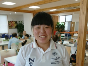 リハビリテーション型デイサービスをバックに写っているのは、安井さんと同じクラスの中植歩美さん。(奈良県立山辺高等学校 バレーボール部出身)