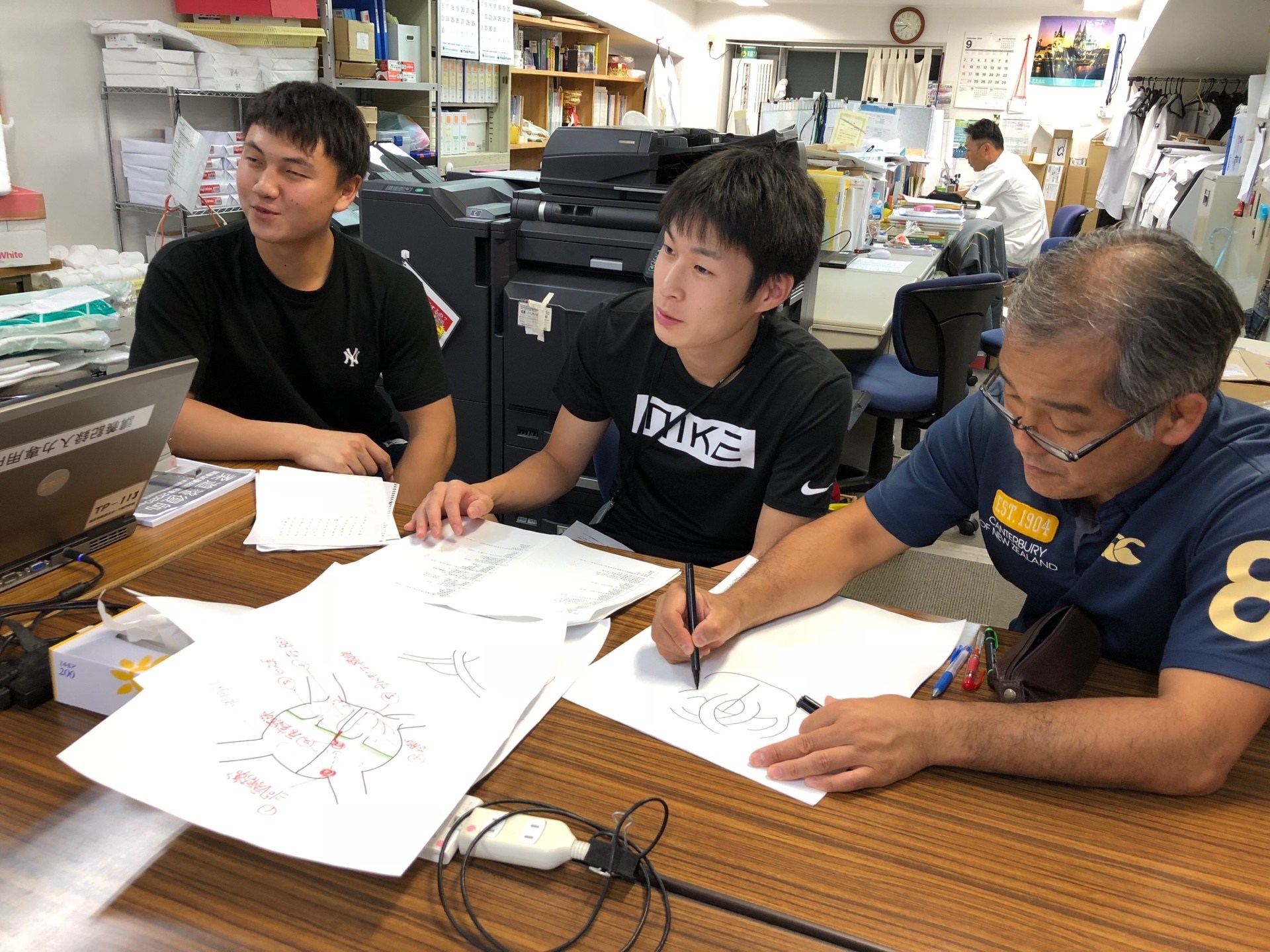解剖学の脈管系について、柔整教員の青木先生にわかりやすく絵に書いて説明していただいてます。