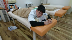 実習中なのにベットに寝そべって、不謹慎と思われるが、接骨院や医療機関でのアルバイト経験のない彼に、低周波や電気治療がどのような刺激なのか、通電のレベルを高くするとどのように感じるのか、温熱療法としてホットパックを受けた感想は、などなど患者さんが様々な物理療法や手技療法で受ける際のシュミレーションを受けているのです。