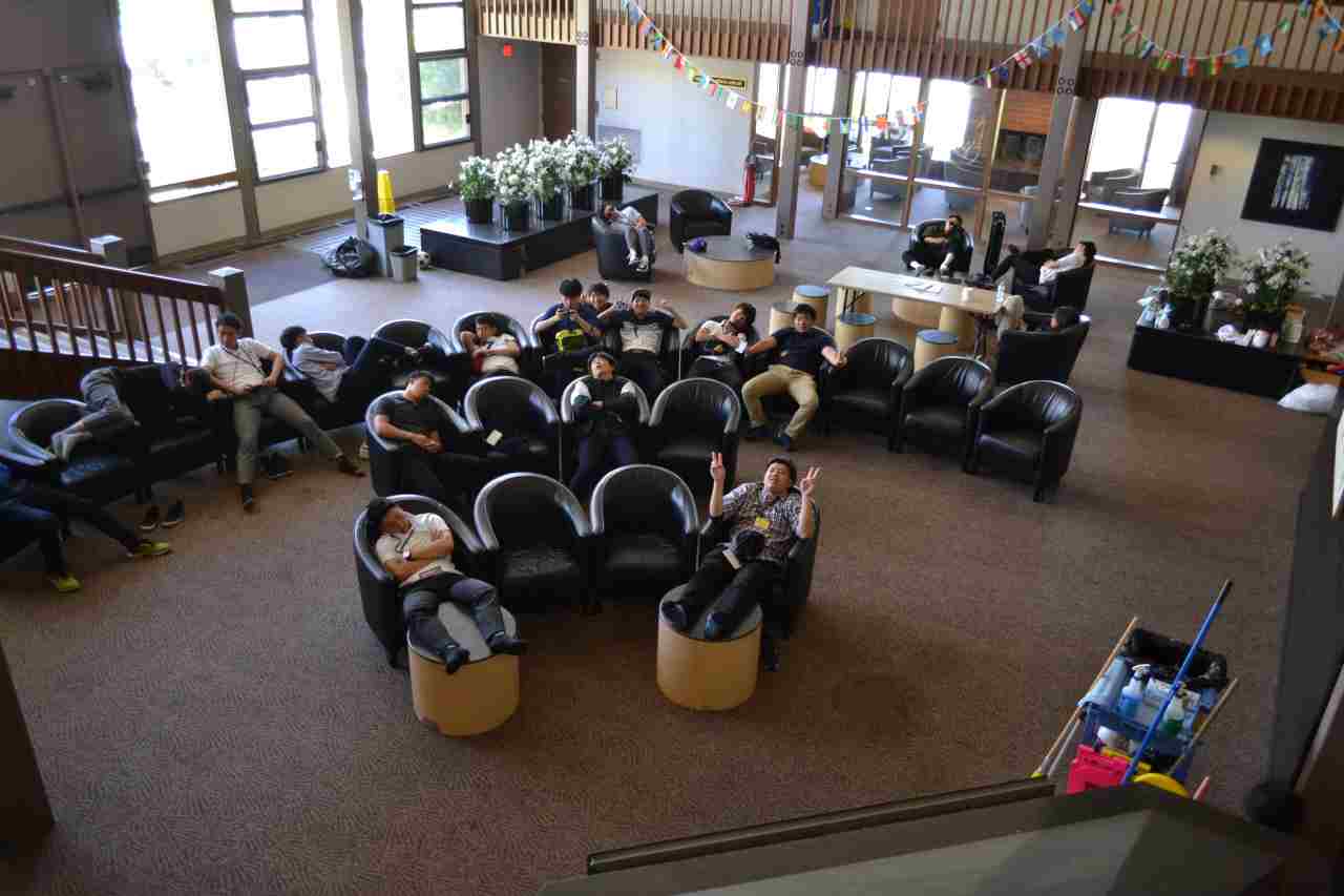 時差ボケ取れず、課題に追われ昼休憩に皆sleeping