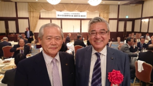 次の写真にある1枚目は、前日夜に開催された開会式での滋賀県会長 仁科 忠宏先生と釜谷理事長校長との写真で、2枚目は履正社柔整3期卒業生の奈良県学術会員、今回の学生発表の座長にも就任されていた、坂口 敦英君です。(当時の担任は辻井先生)