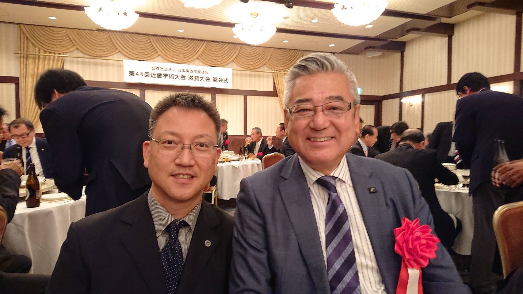 次の写真にある1枚目は、前日夜に開催された開会式での滋賀県会長 仁科 忠宏先生と釜谷理事長校長との写真で、2枚目は履正社柔整3期卒業生の奈良県学術会員、今回の学生発表の座長にも就任されていた、坂口 敦英君です。(当時の担任は辻井先生)