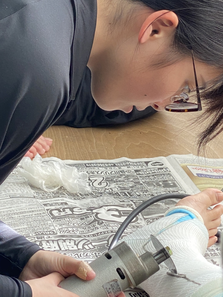 「今回の実習では、キャストライトをいかに早く綺麗に巻けるか、ギプスカッターで安全かつ丁寧に切れるか、という点に気を付けながら頑張りました。