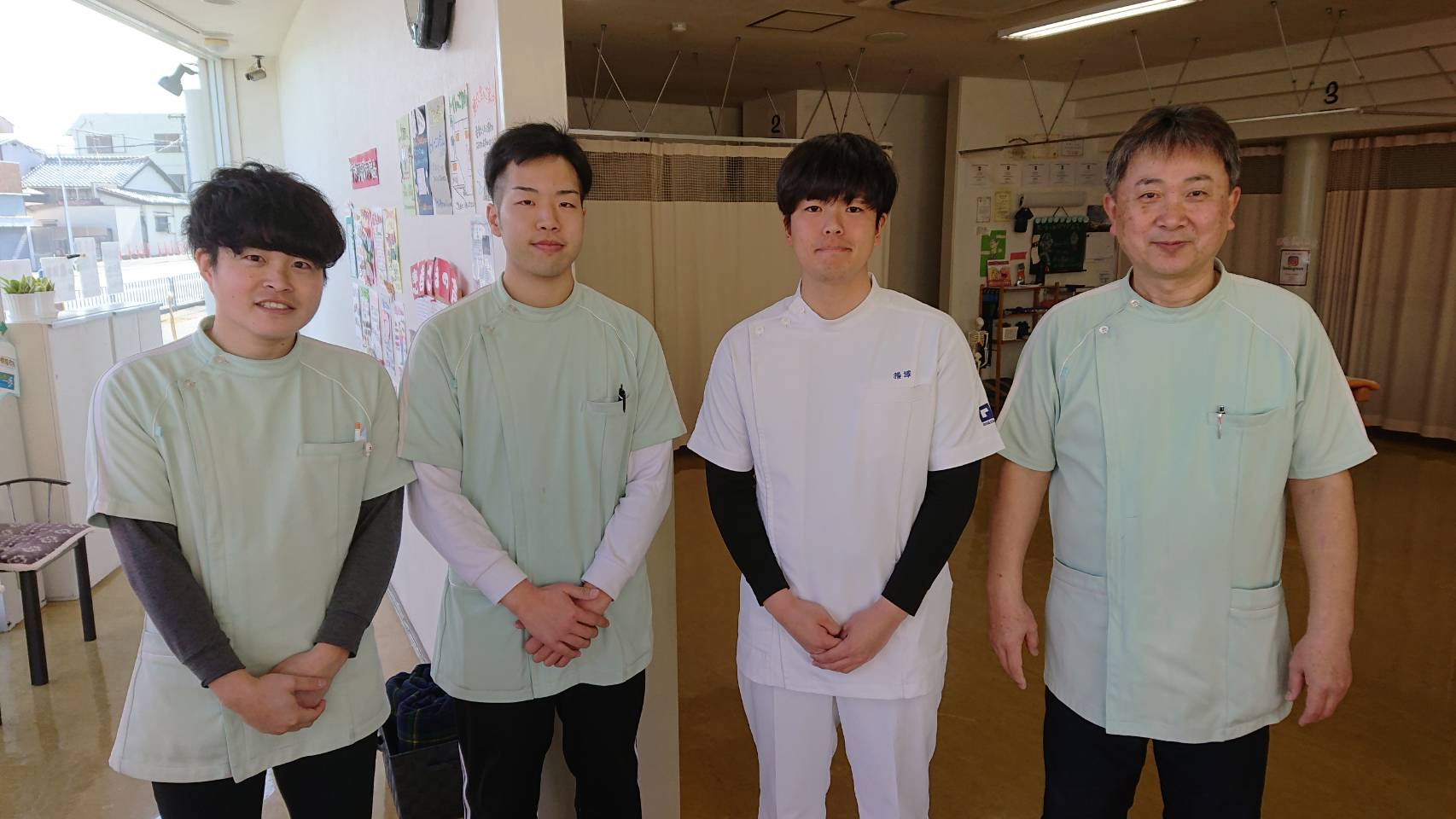 左から8期卒業生の三好君、14期卒業生の川西君、実習生の横澤君、院長の森先生。