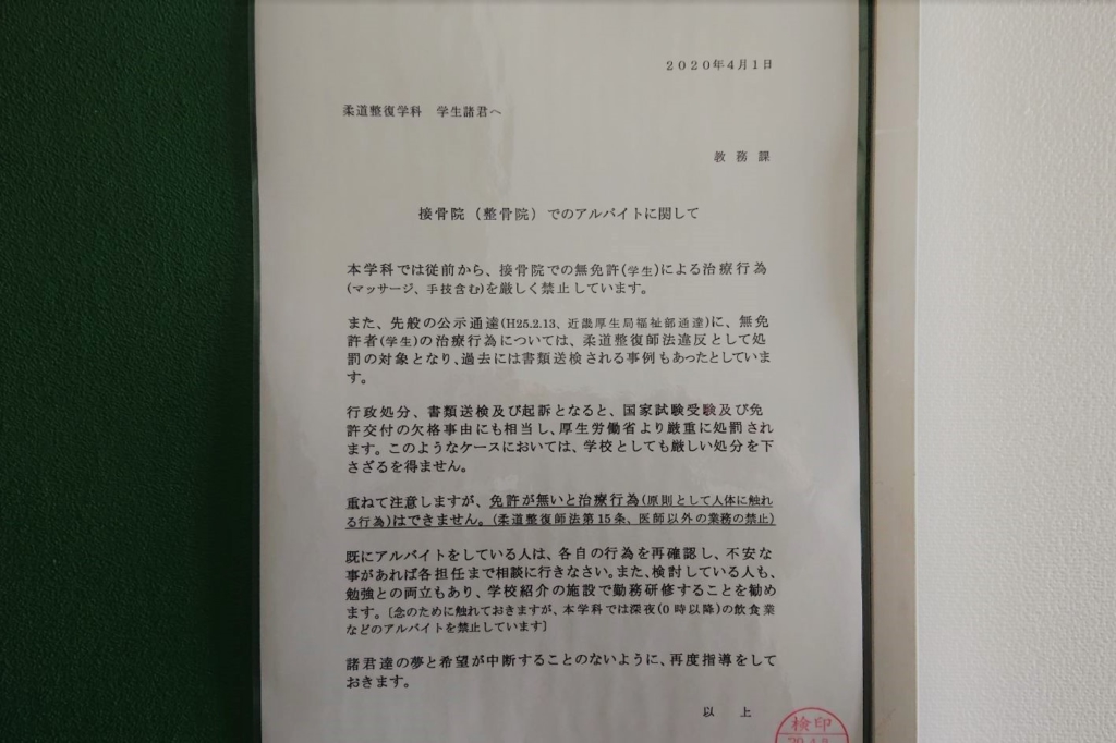このことの注意喚起文章です。もちろん履正社 柔道整復学科に処分(行政および学則処分)を受けた学生はいませんが、解釈を徹底し毎年掲示しています。