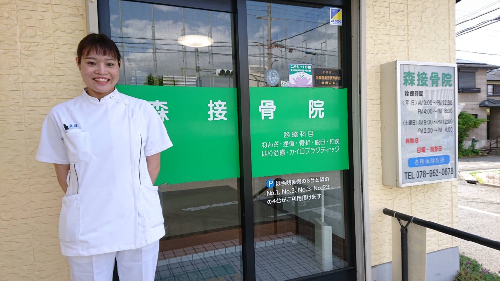 神戸市にある森接骨院は、履正社 柔道整復学科の臨床実習施設で、厚労省認定臨床実習指導者資格を持つ、森 正院長の下で臨床実務研修を受けている。