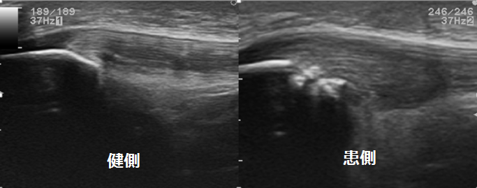 同部位を超音波エコーで観察してみました。健側(正常な膝)と比べると、ずいぶん腫脹しているのがわかると思います。