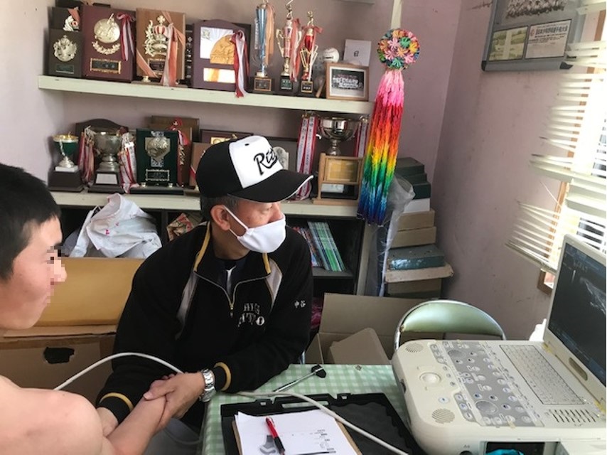 毎年、超音波観察装置を使い、選手達の肩と肘関節の状態を把握するようにしています。