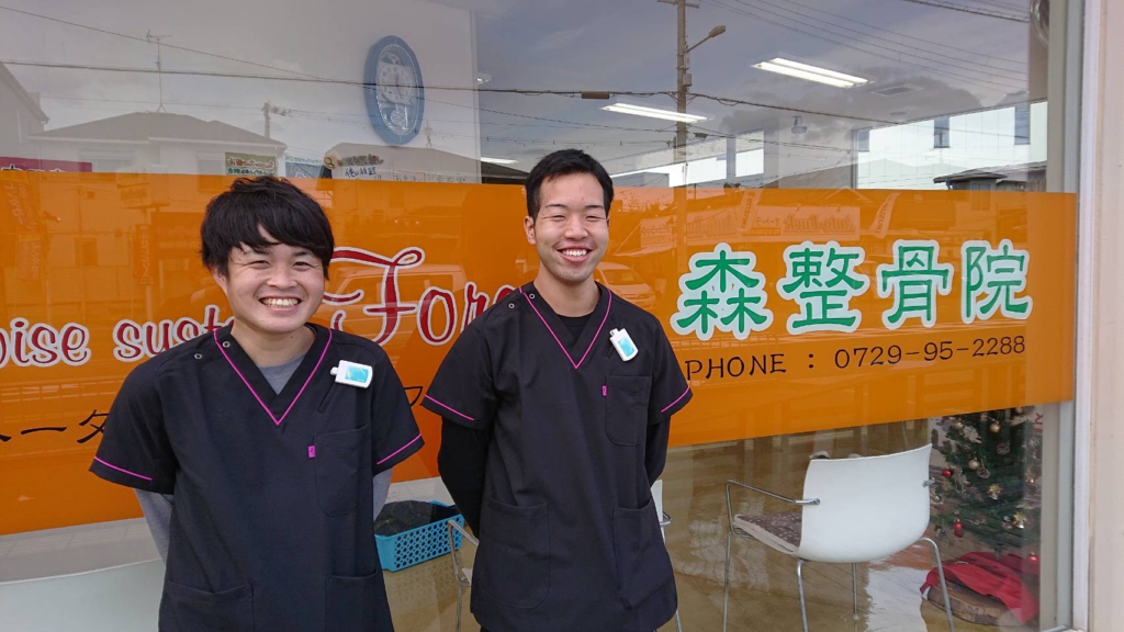 写真にあるのは、八尾市で開業している、履正社柔整実習施設の森整骨院に勤務している8期卒業生の三好君と14期卒業生の川西君。