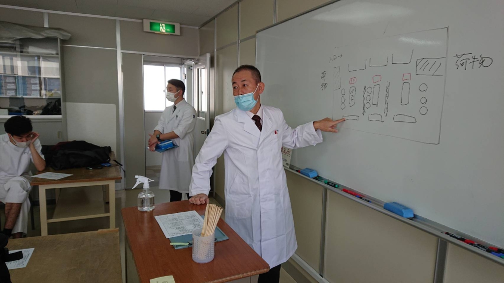 感染症対策徹底、マスク着用、手指消毒と、控室も試験会場も換気で窓を開放しているので、白衣の上にジャケットやオーバーを着ている学生も。(試験の際は脱ぎます)