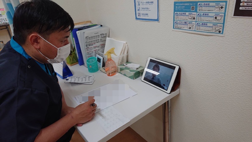 オンラインで、実習前現地指導会を受けているのは、2年志水君。