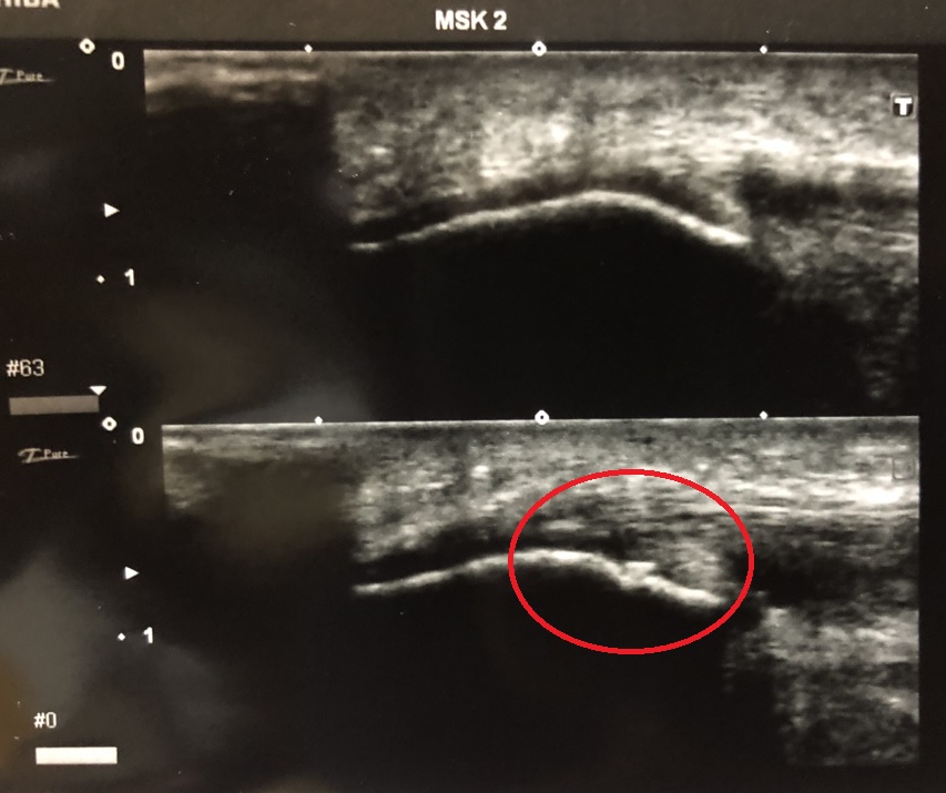 奥田院長が、超音波エコー観察検査を実施。写真にあるように骨折が確認され、野球のトレーニングによる、右脛骨疲労骨折の疑いありと判断。1か月ほどの安
