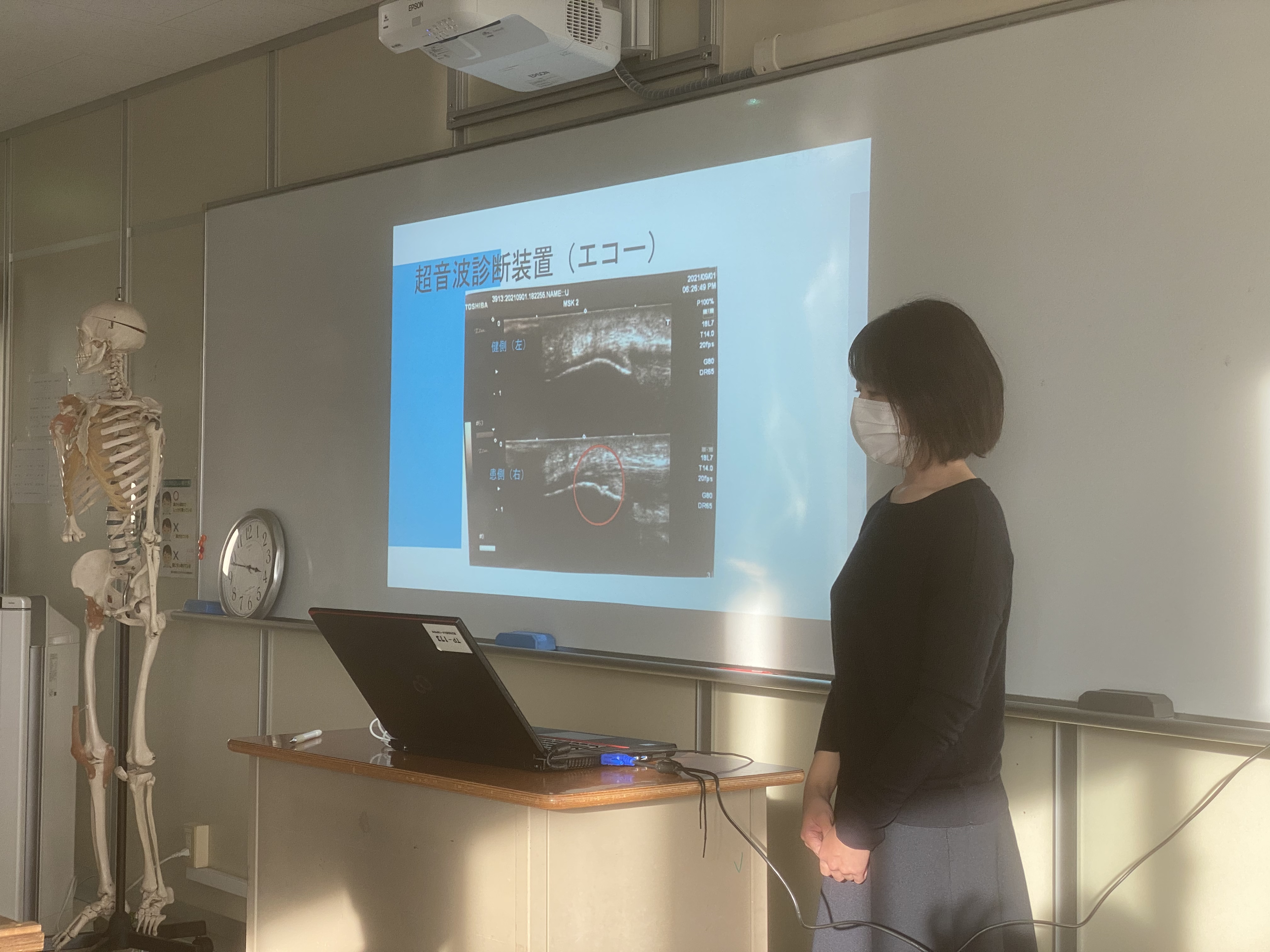 さて、実習期間中のブログでも紹介したが、彼女は超音波エコー観察検査に興味と関心があり、奥田院長自らも複数回、甲子園出場を果たし、現在も甲子園出場経験のある高校でトレーナーをしている、京都かもがわ整骨院(奥田院長)で実習を受けた。その発表風景と症例を紹介しよう。