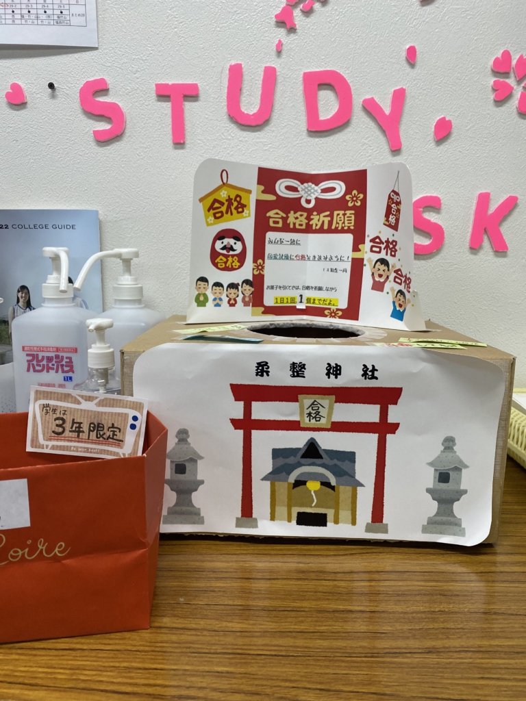 柔道整復学科の職員室には、学生が勉強できる机が用意されています。今その机の上には、受験生応援!!っていうことで、各先生方が糖質、栄養補給っていうことでおやつをカンパしあって学生に提供しています。
