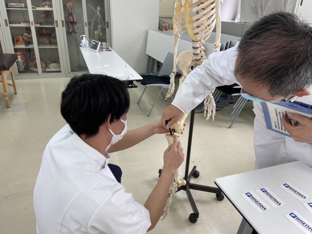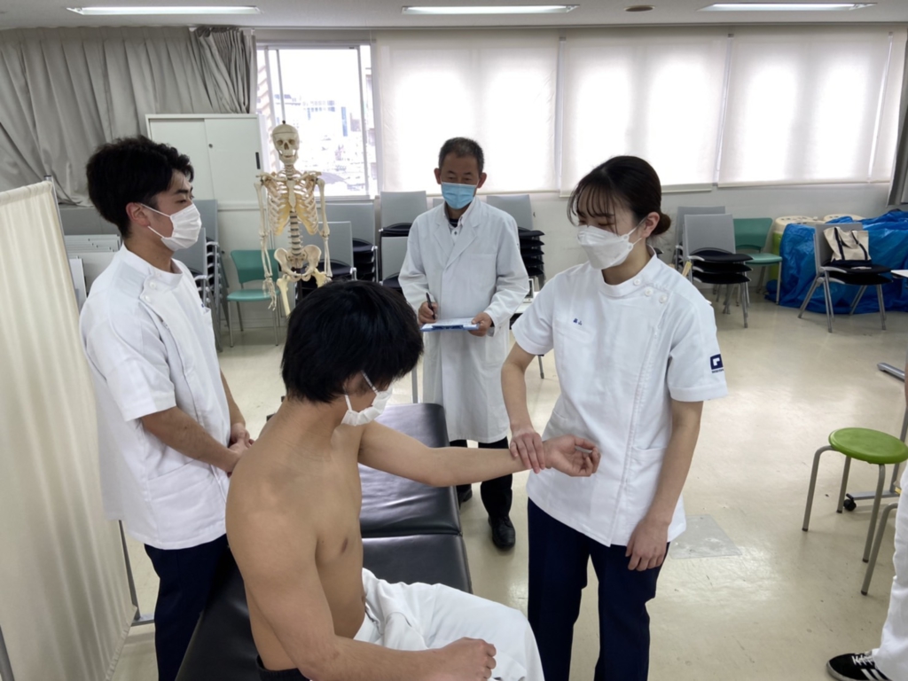写真にあるのは、接骨医療専門実技教科担当、中谷功先生の実技試験のようす。