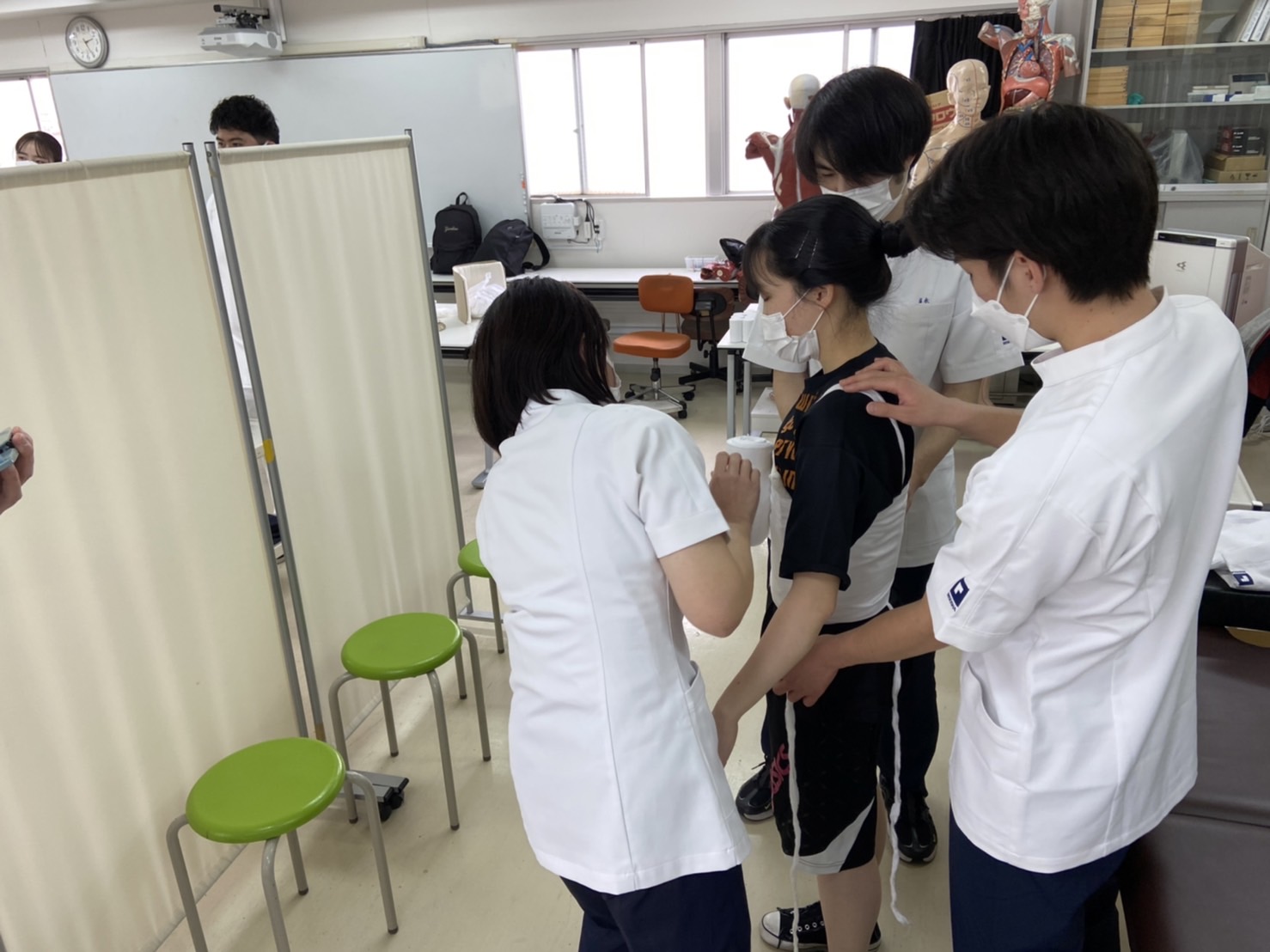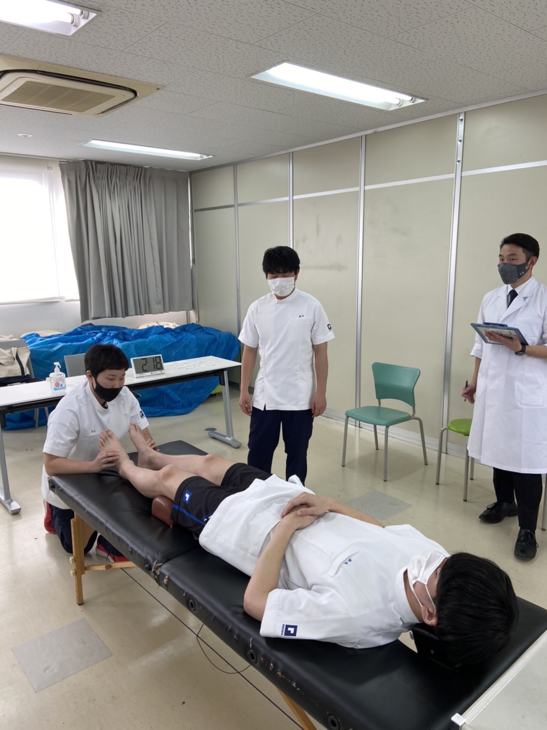 写真にあるのは、接骨医療専門実技教科担当、中谷功先生の実技試験のようす。
