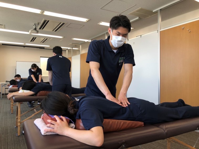 研修所では、マッサージの練習や同期の仲間同士でディスカッションを通して積極的に意見を言う大切さなどを学んでいます。